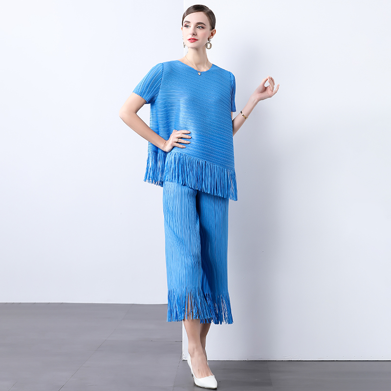 Miyake European and American style pleated fringe design, loose and irregular top, slimming and wide leg pants two-piece set for women