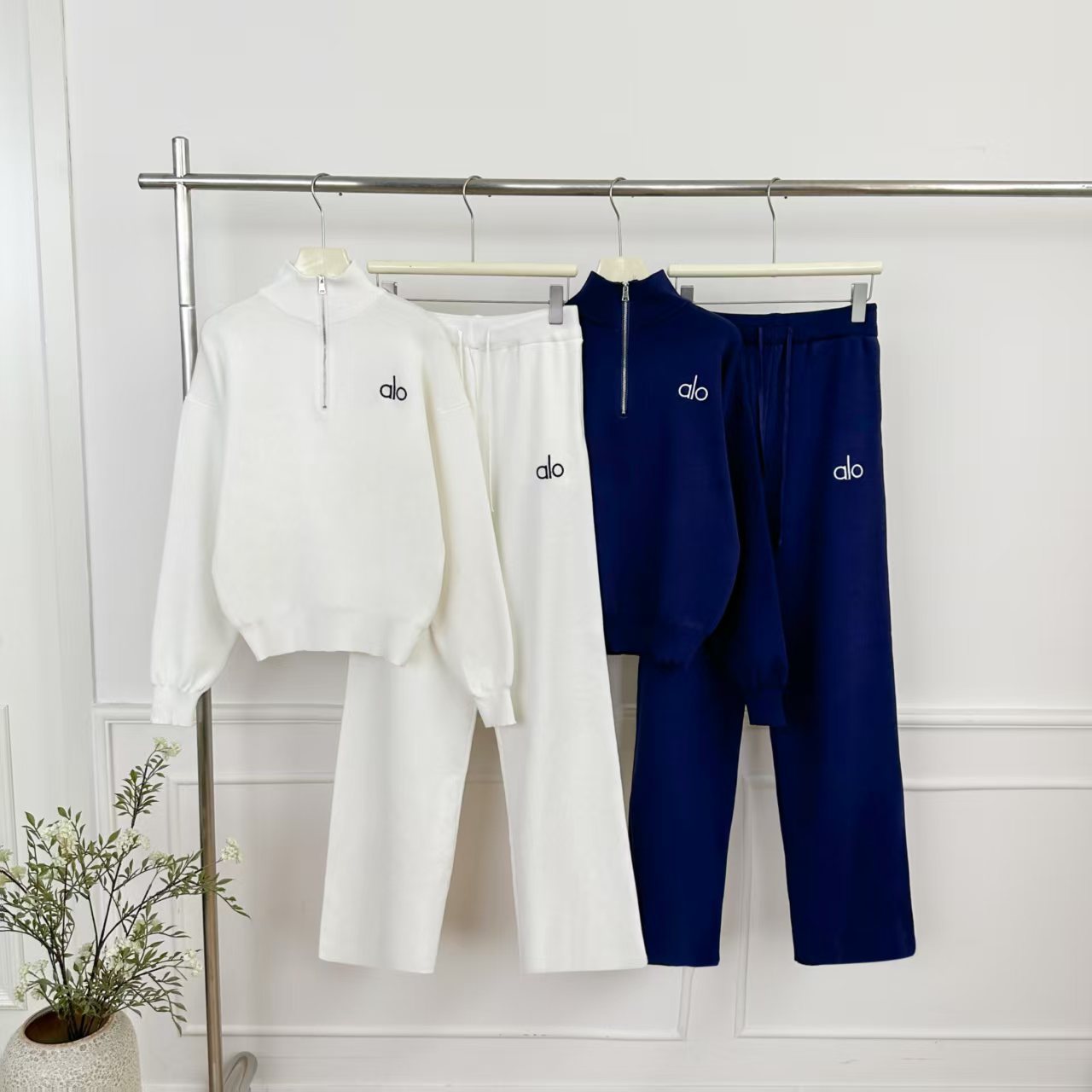 2025 Fashion Leisure Knitted Set Two Piece Sports Set Stand up Collar Half Zipper Top Wide Leg Pants Foreign Trade