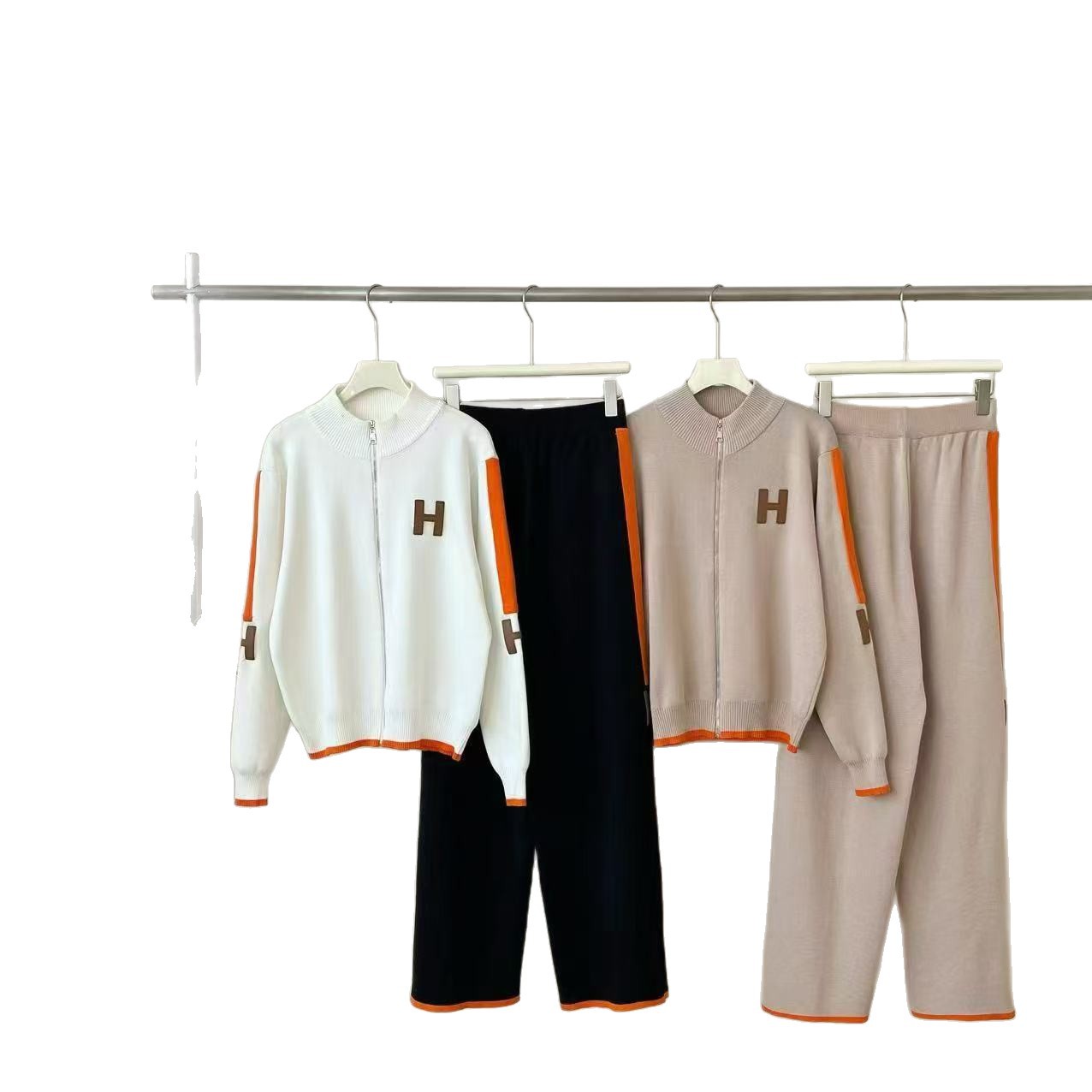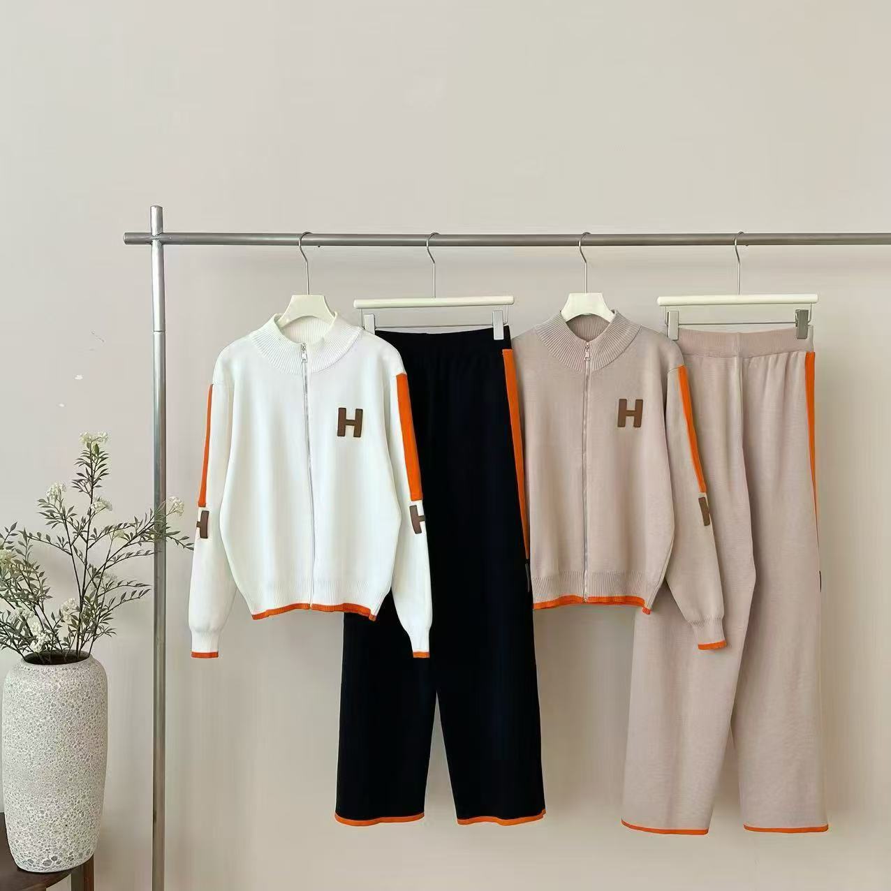 Foreign trade plus size 2025 spring new product outerwear zipper women's knitted set two-piece set letter long sleeved wide leg pants