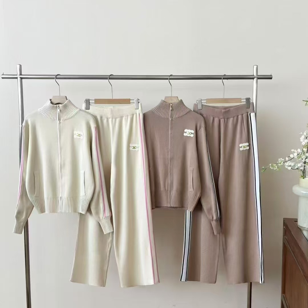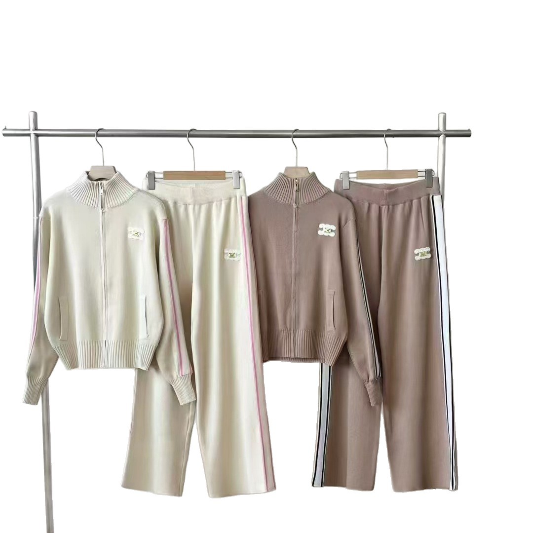 Cross border 2025 new slim fit sports style zipper top, wide leg pants, knitted two-piece set, versatile and luxurious