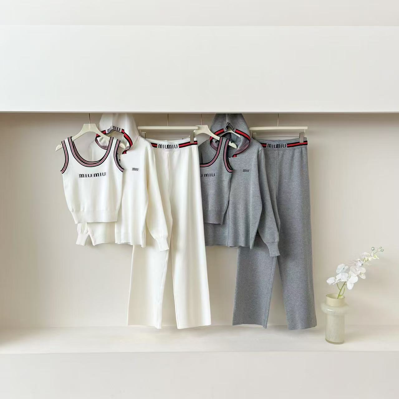 Cross border new vest letter round neck pullover hooded cardigan jacket wide leg pants knitted fashionable versatile three piece set