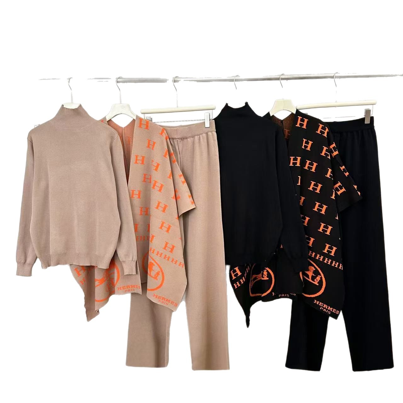 European station high-end semi high neck knitted top with letter printed cape and wide leg pants temperament three piece set