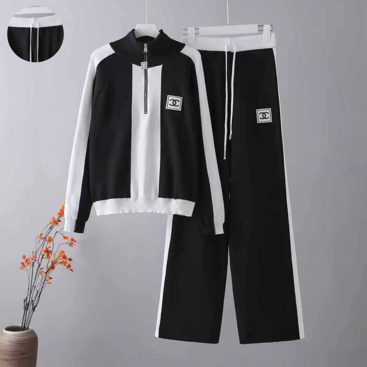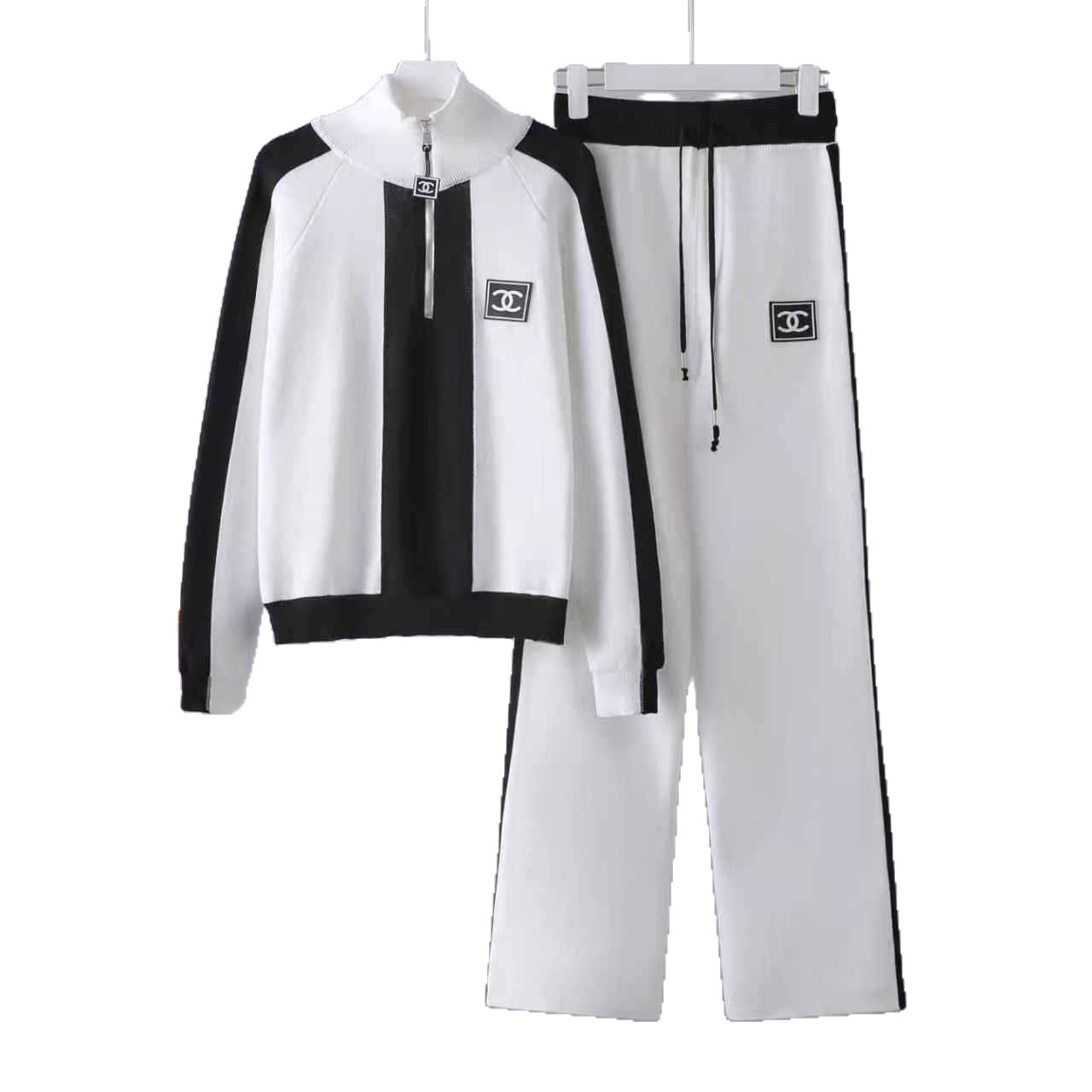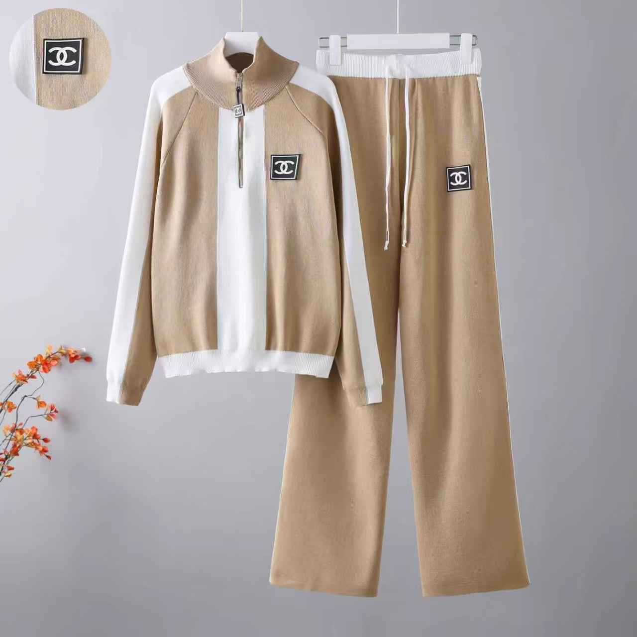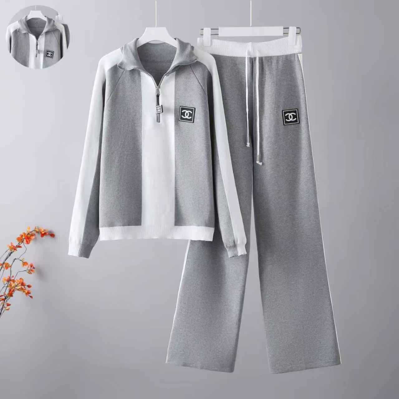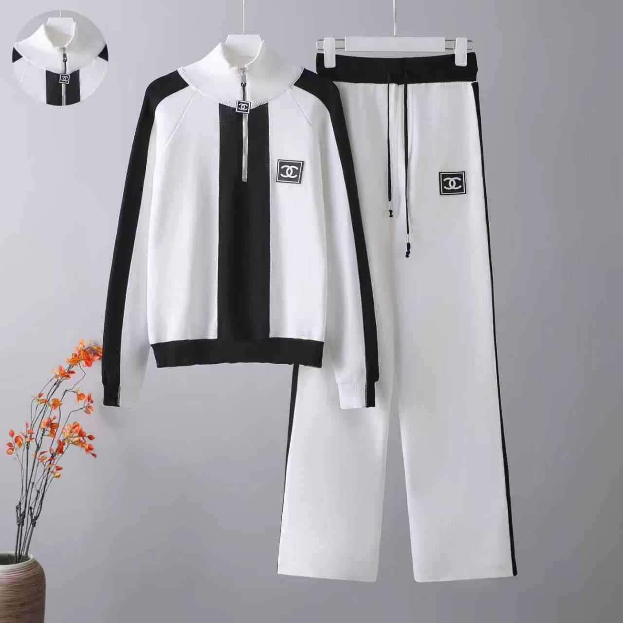Cross border 2025 early spring new sports and leisure half zipper long sleeved contrasting knitted jacket+two wide leg pants