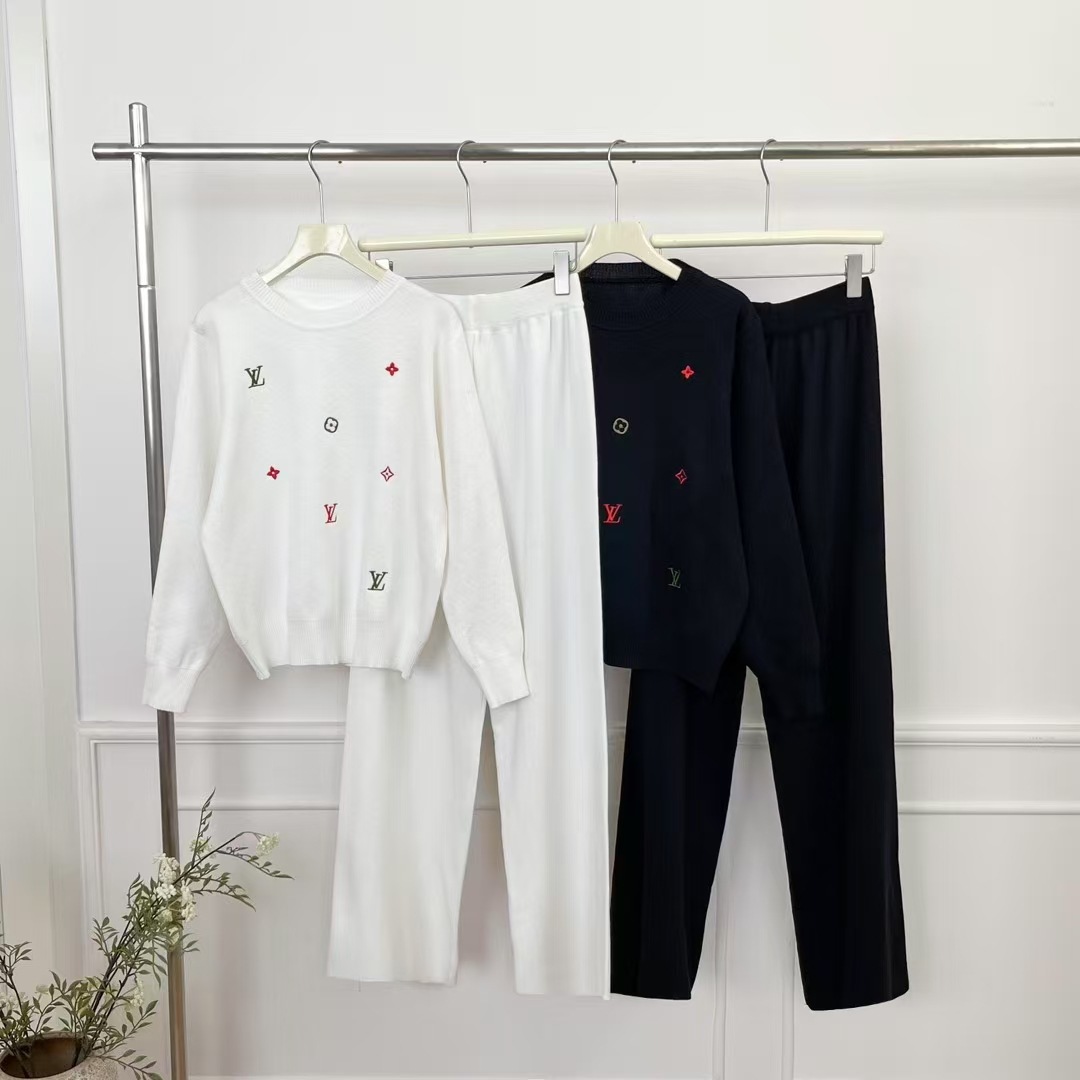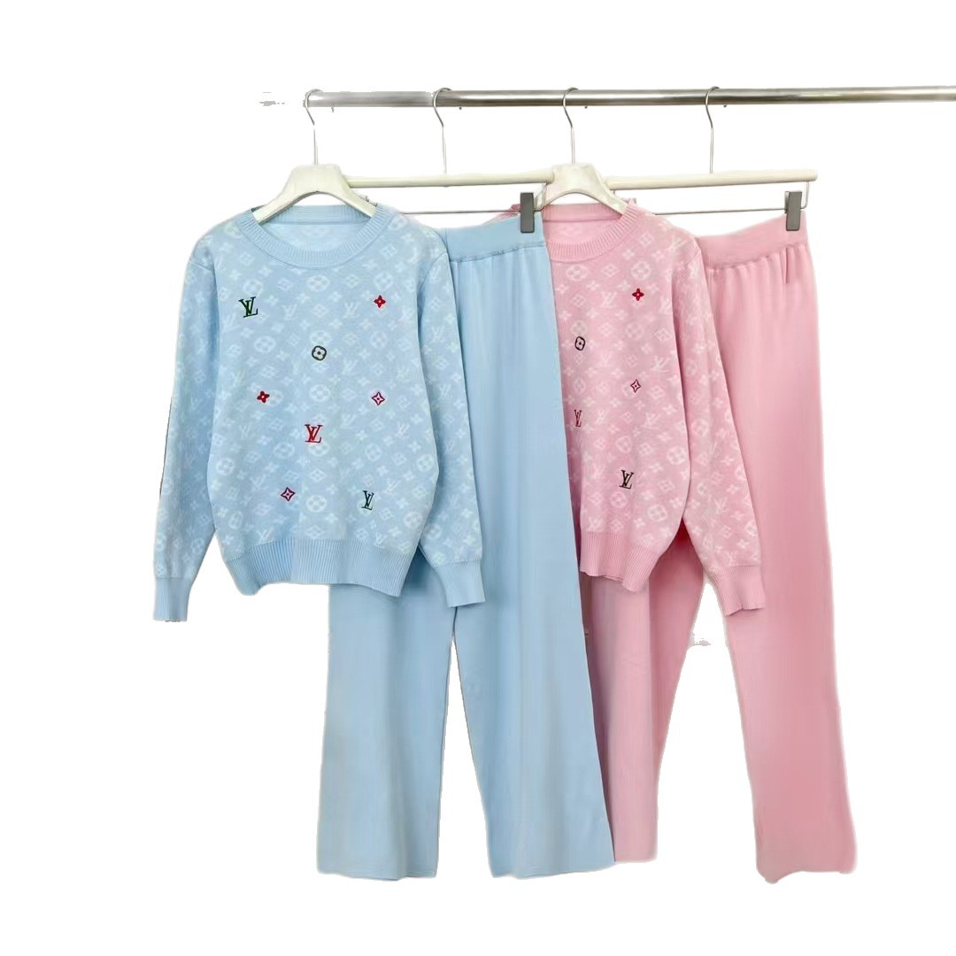 Cross border 25 Summer New Fashionable Versatile Letter Embroidered Knitted Shirt Explosive Round Neck Top Wide Leg Pants Two Piece Set