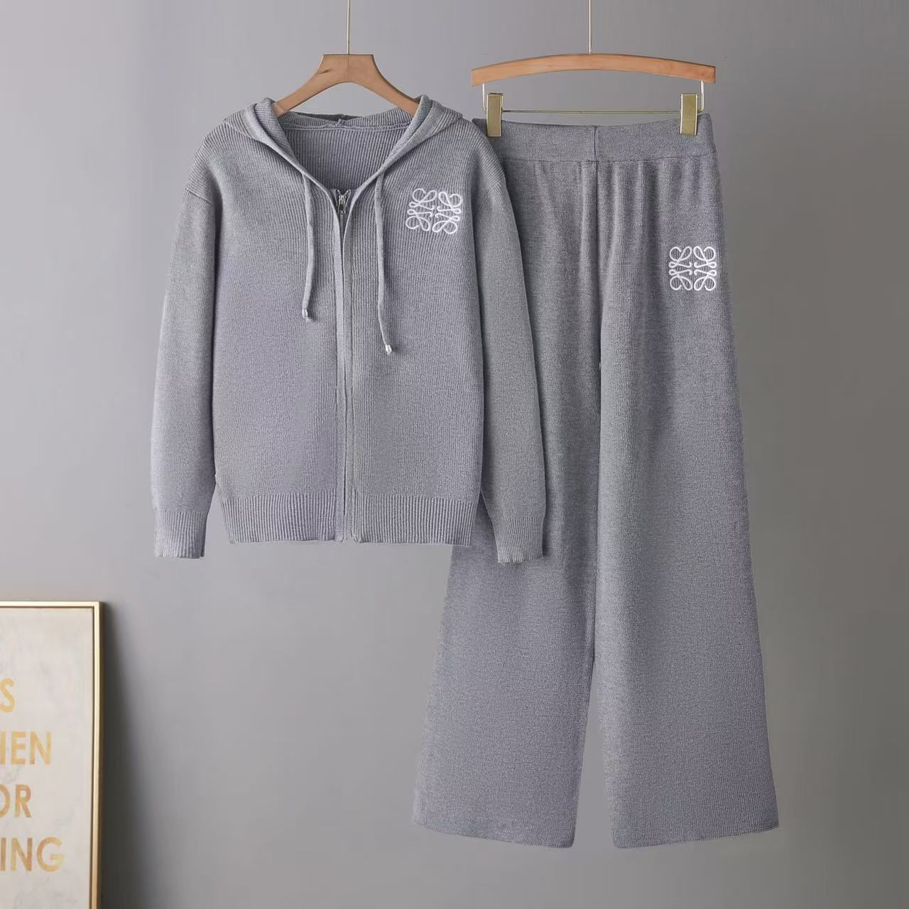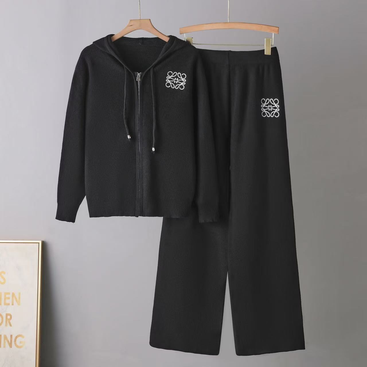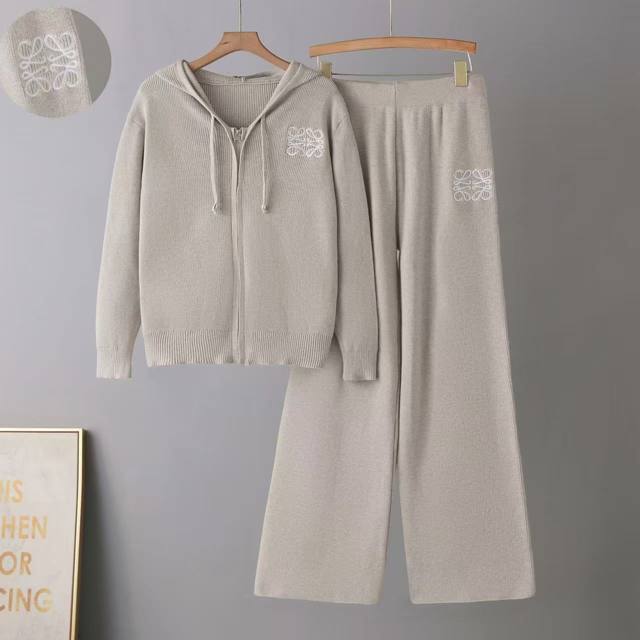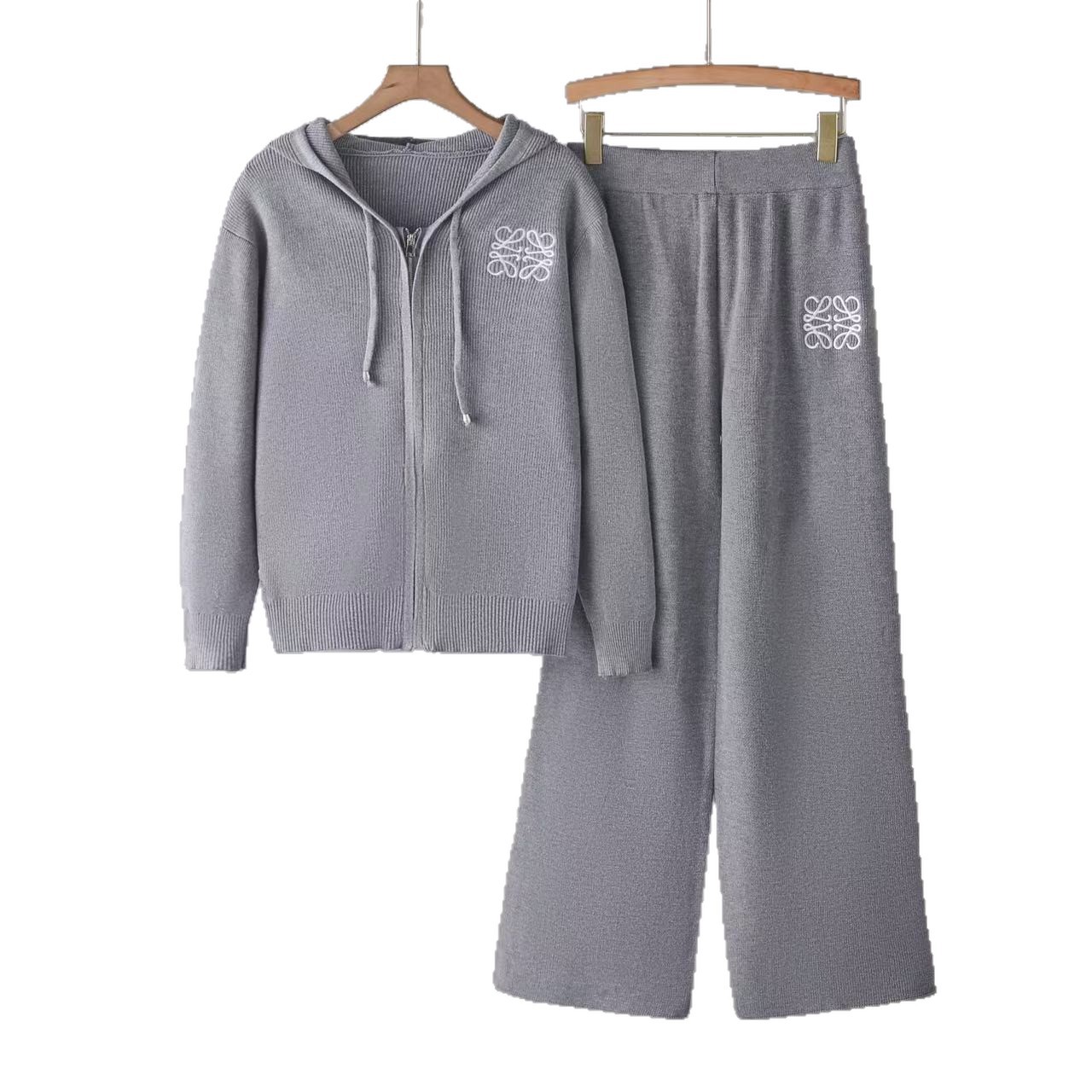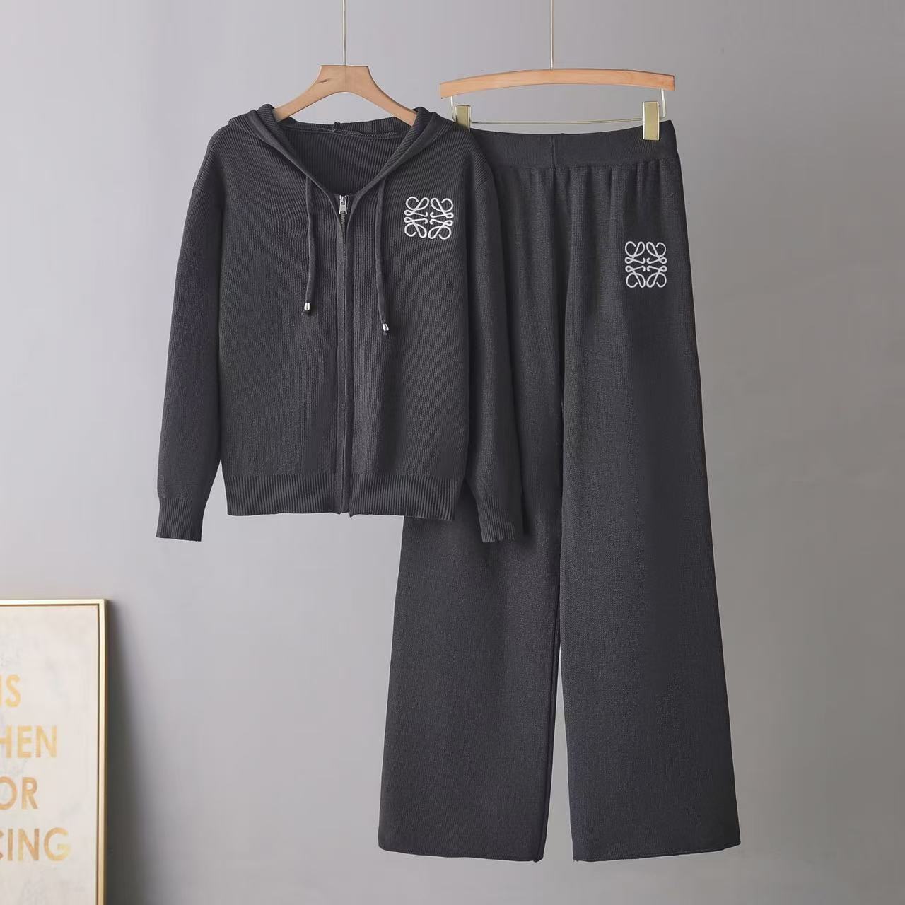 Cross border 25 year autumn and winter new hooded embroidered knitted cardigan casual wide leg pants two-piece lazy style set