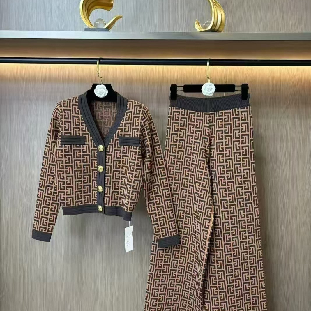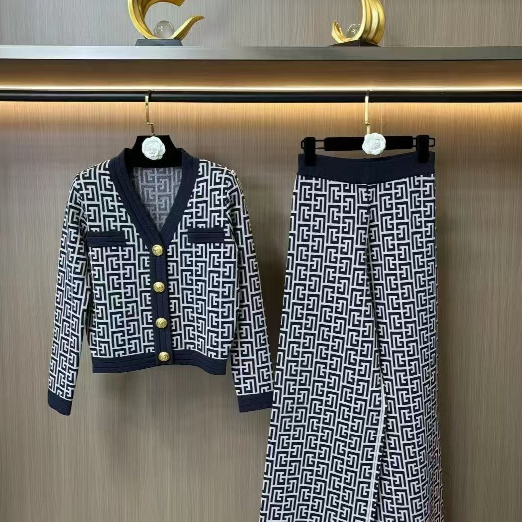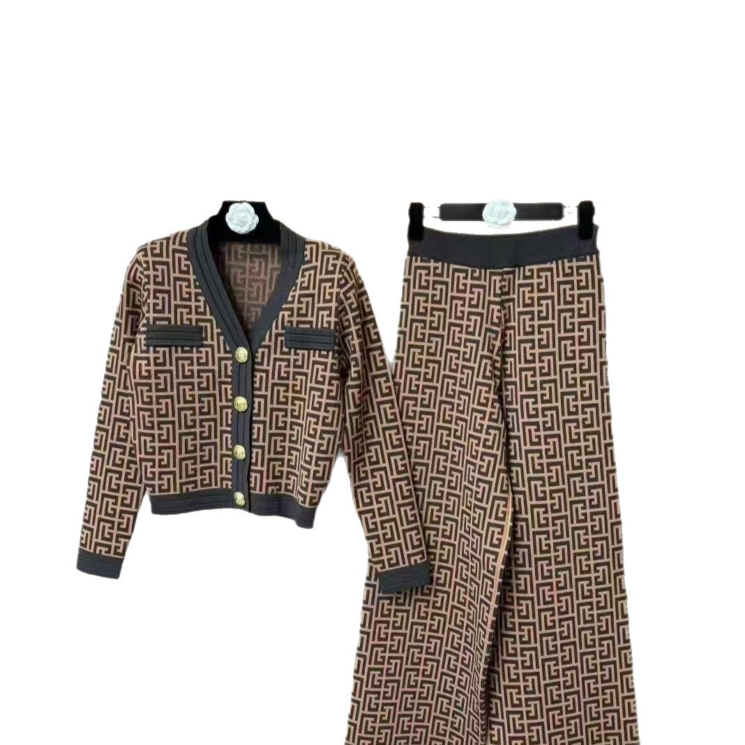Cross border 2025 Autumn New Full Jacquard V-neck Cardigan+Pants Knitted Two Piece Set