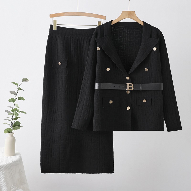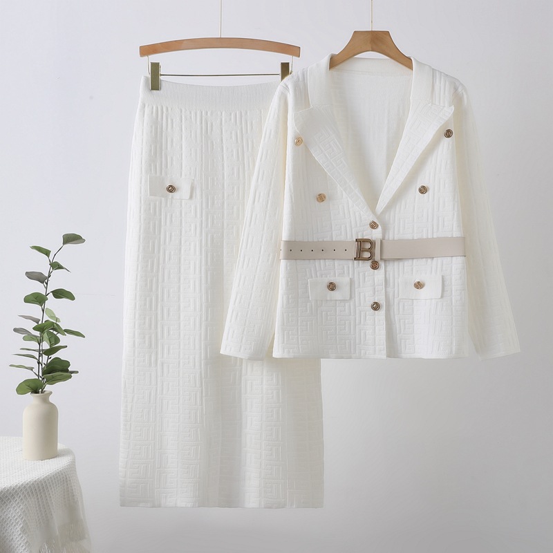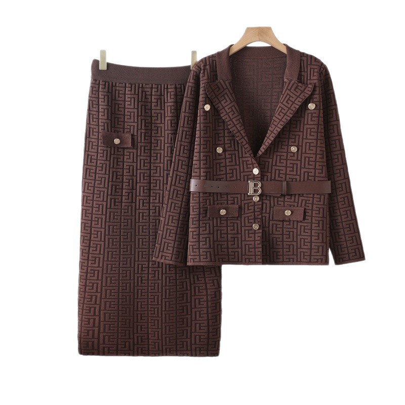 Cross border new comfortable women's clothing maze jacquard pattern B-shaped double breasted lapel, waist cinched knit long sleeved+skirt