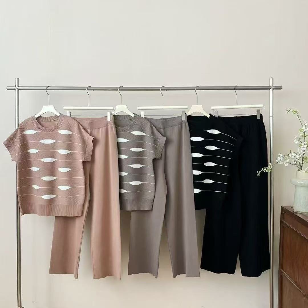 Fashion suit women's 2025 spring new striped knitted sweater top+high waist wide leg pants casual two-piece set trendy