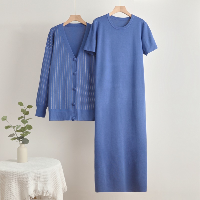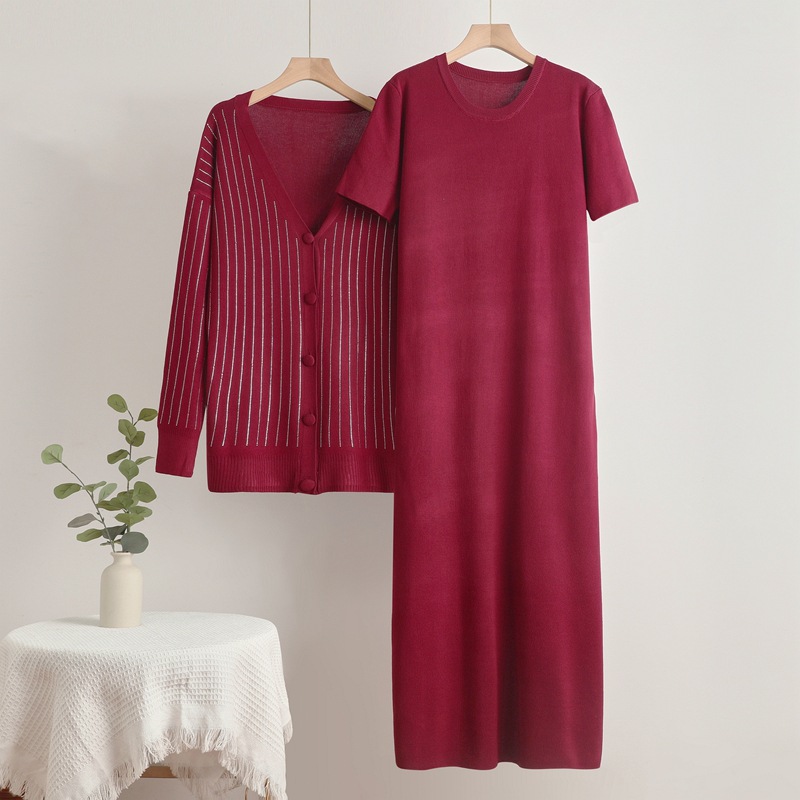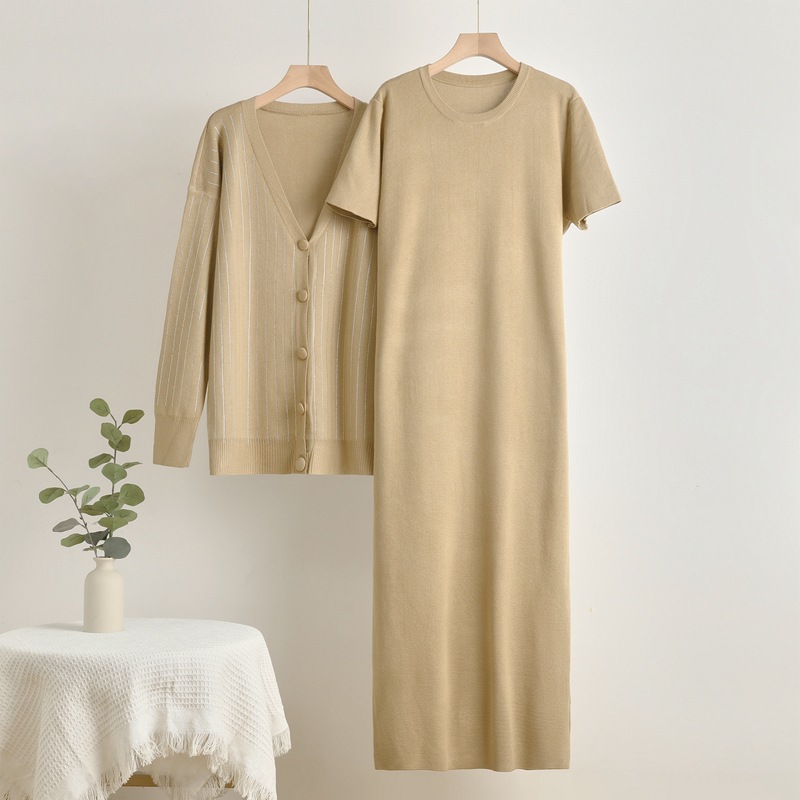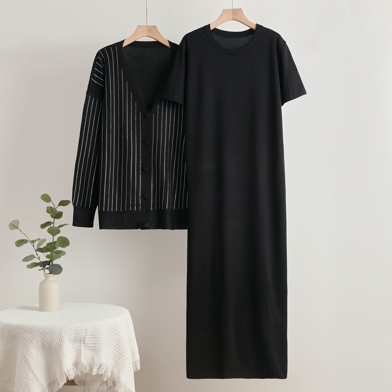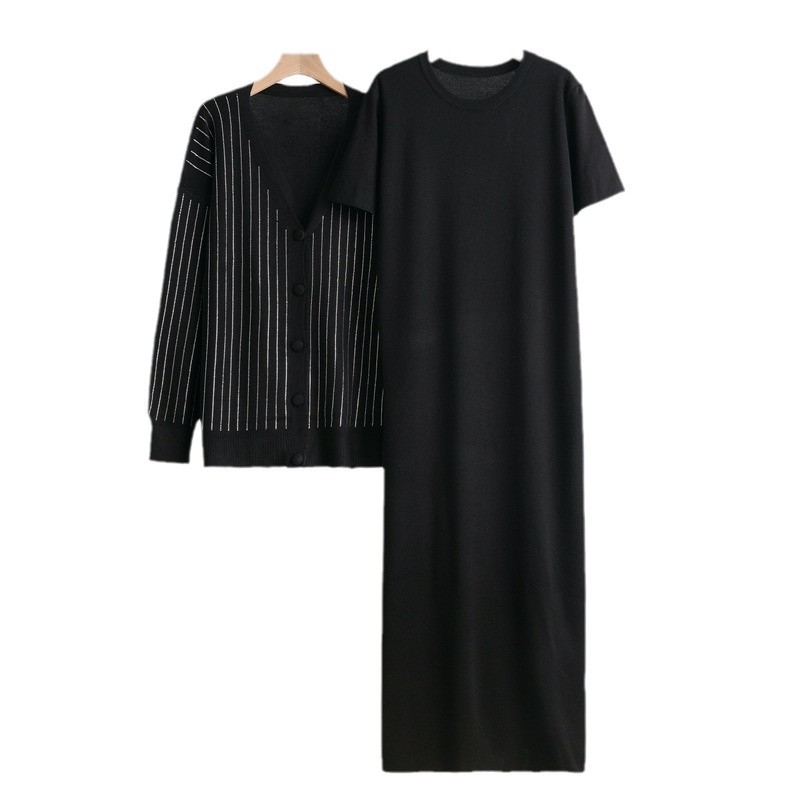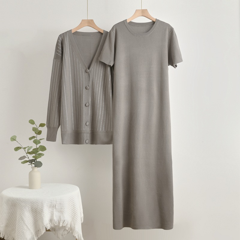 Cross border foreign trade Spring and Autumn new loose knitted hot stamping jacket cardigan+casual medium long dress two-piece set