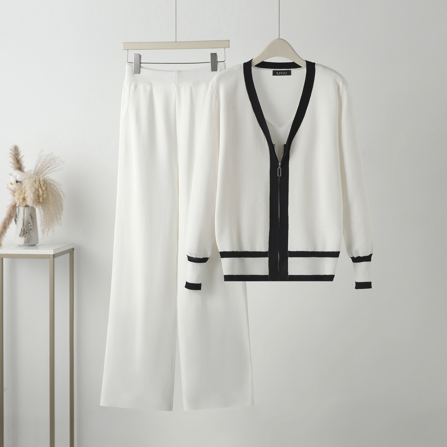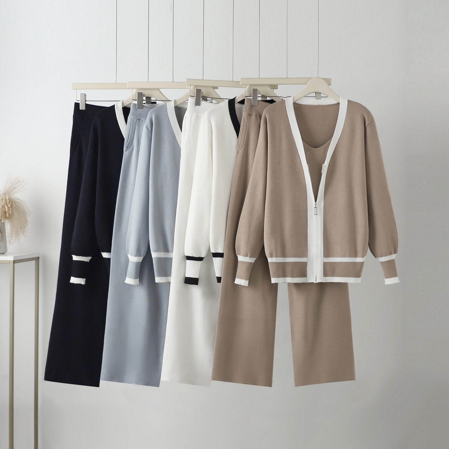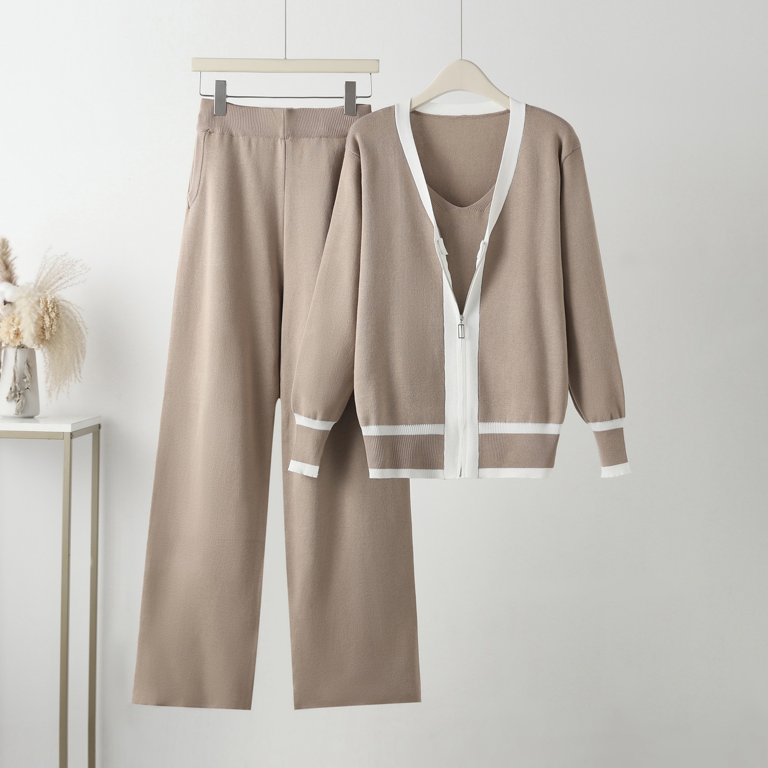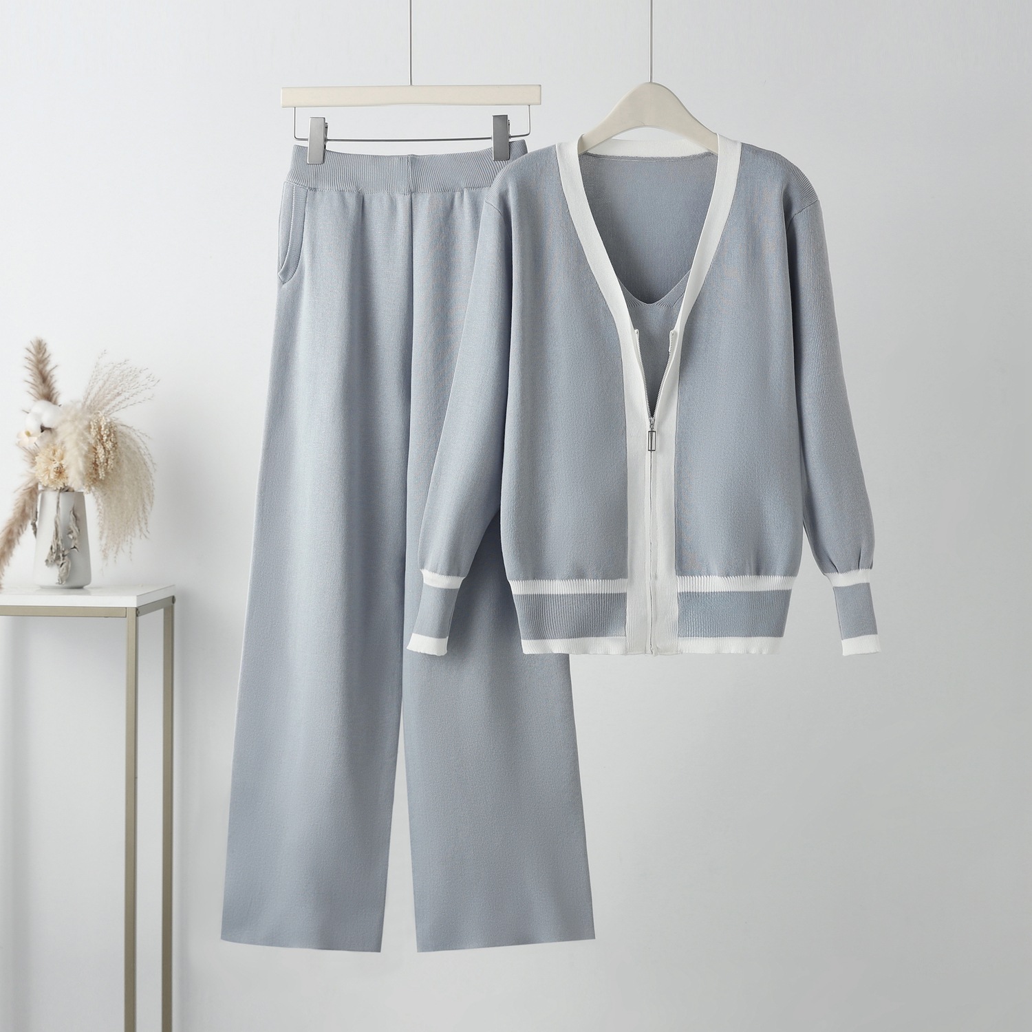 Knitted new three piece European fashion suit cardigan loose strap slimming wide leg pants 2023 autumn women