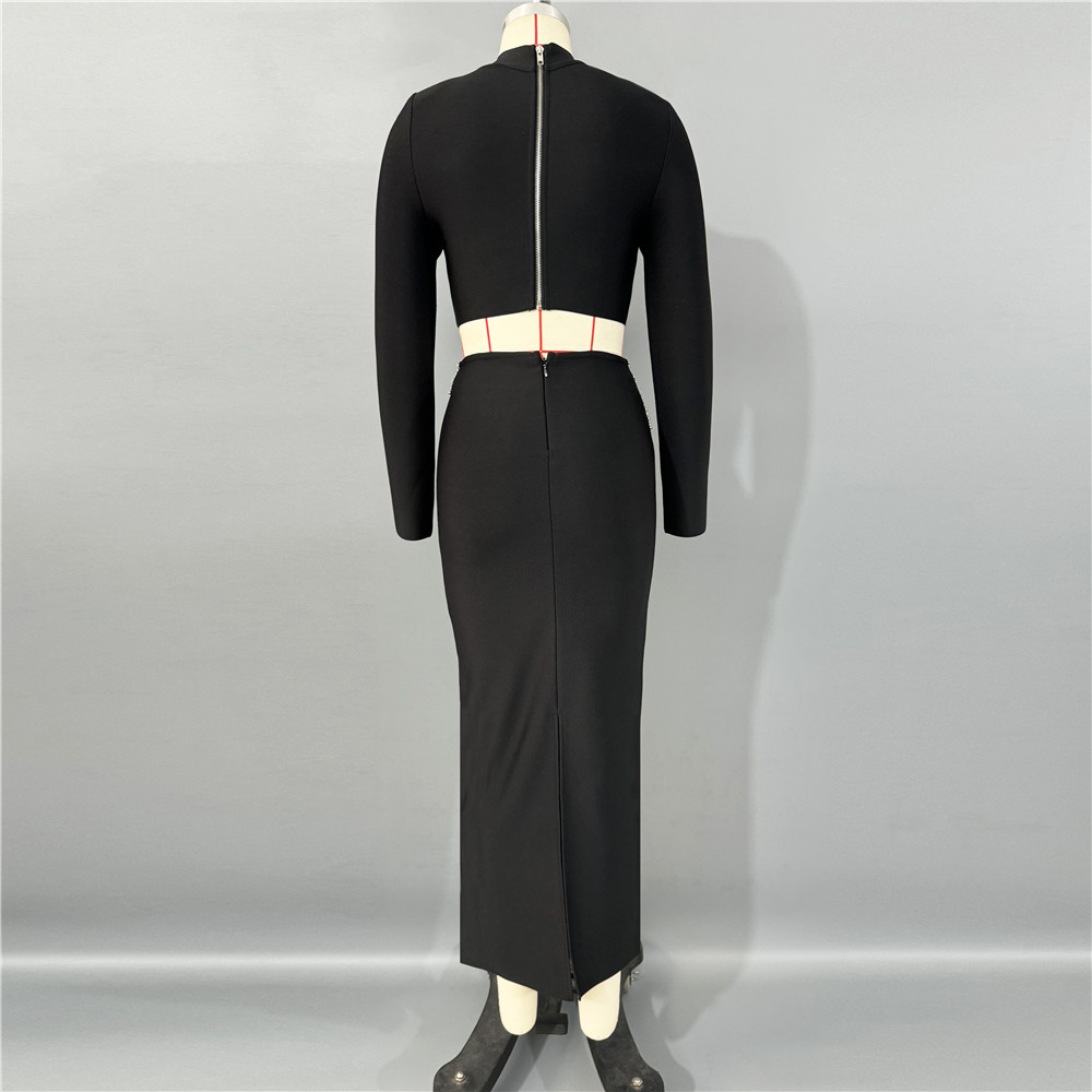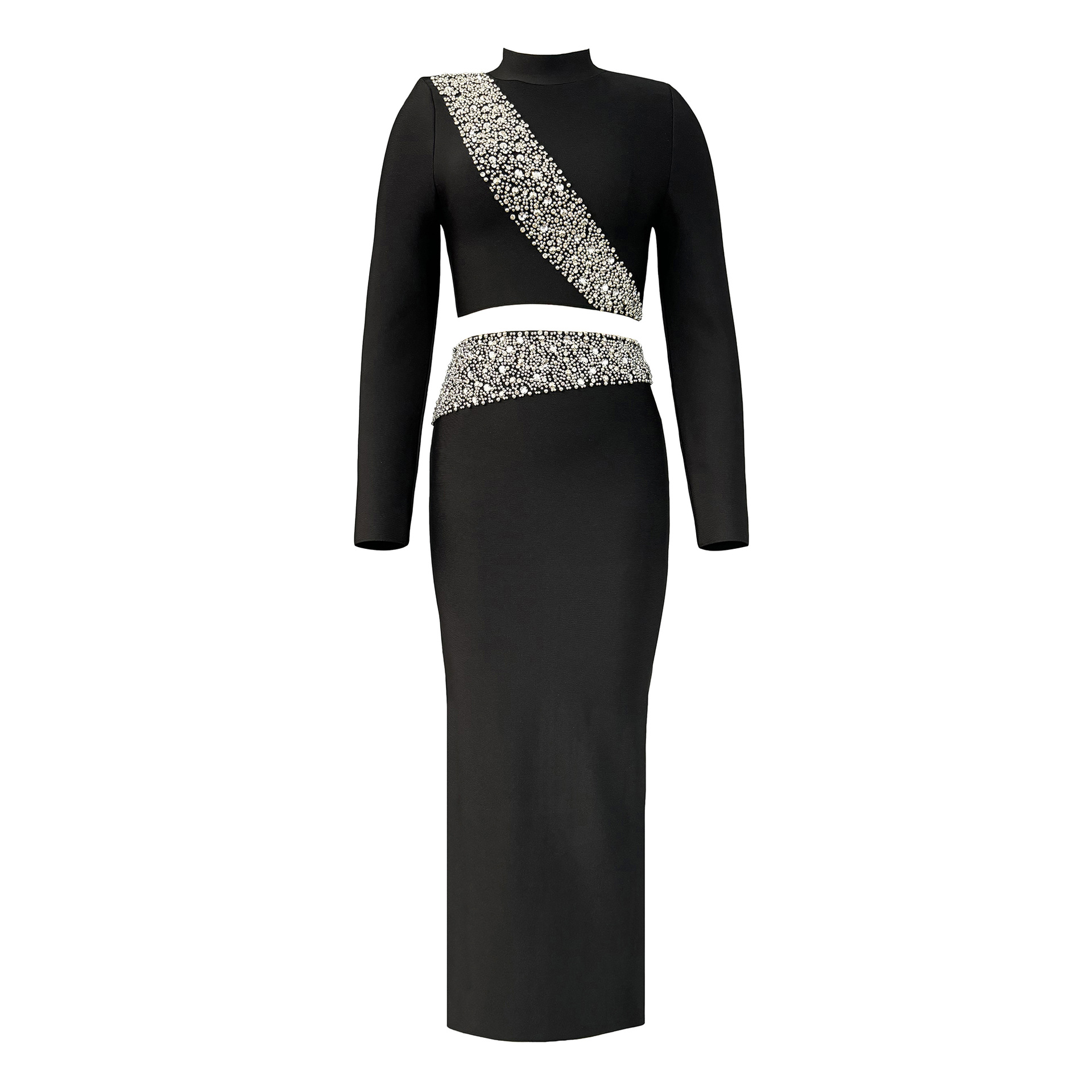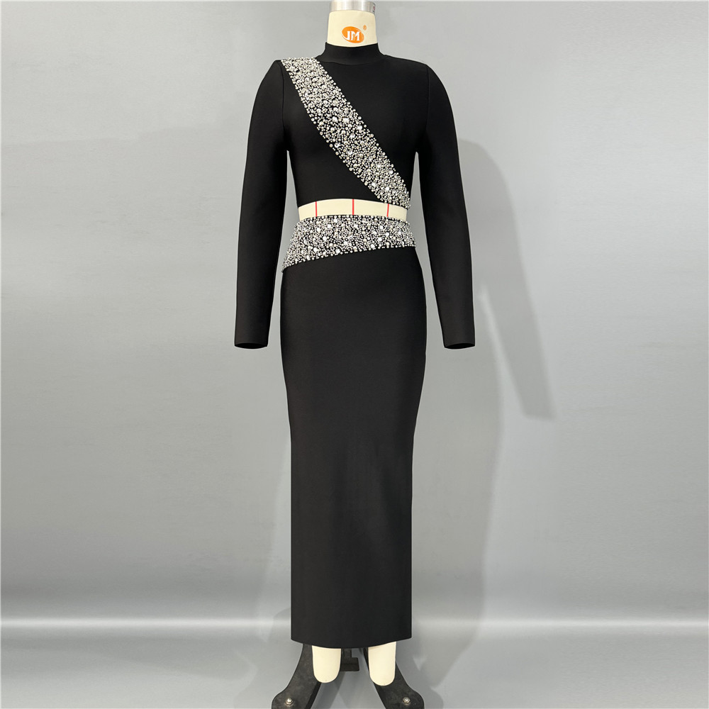 European and American cross-border fashion nail bead inlaid diamond bandage set sexy exposed navel long sleeved top long skirt two-piece set women's clothing