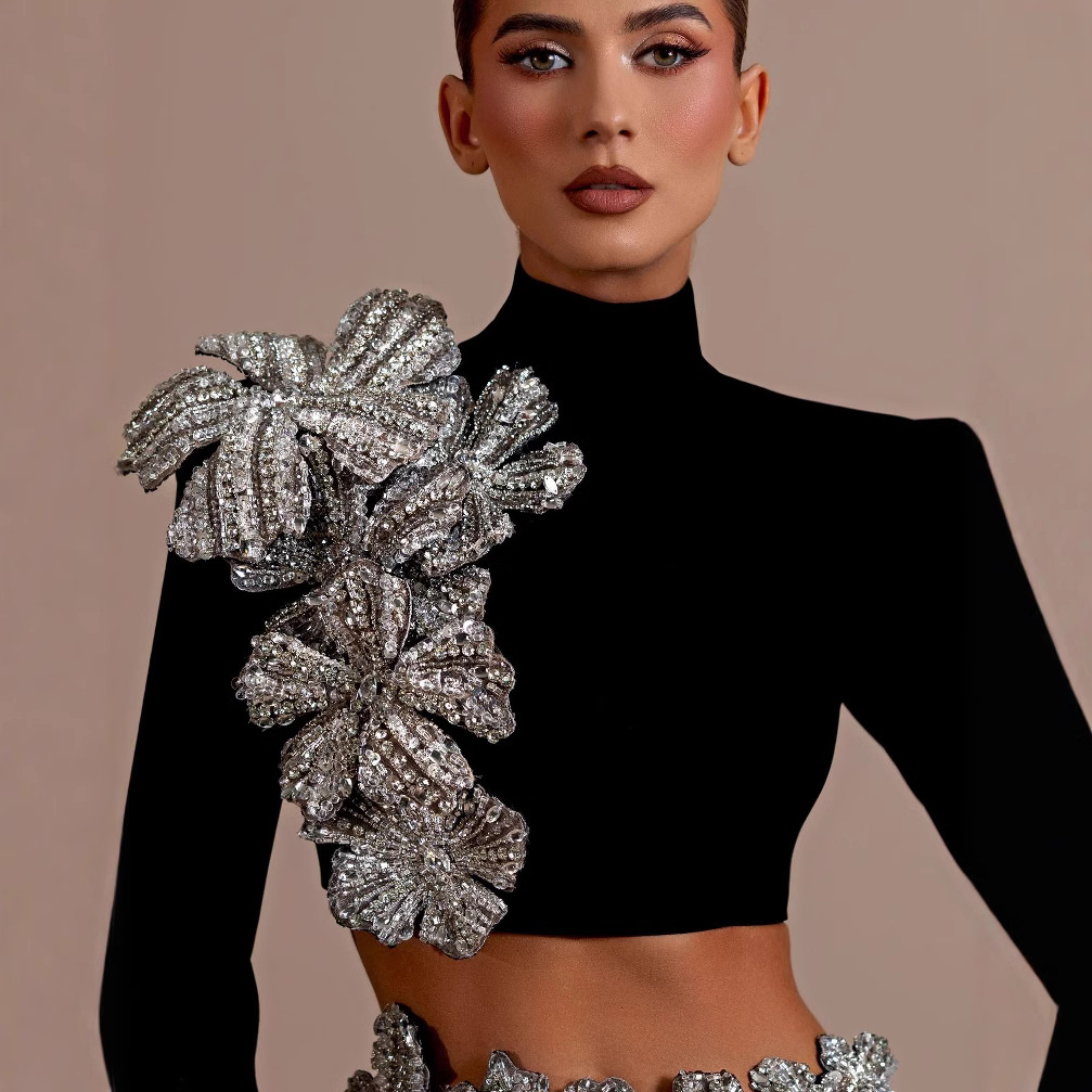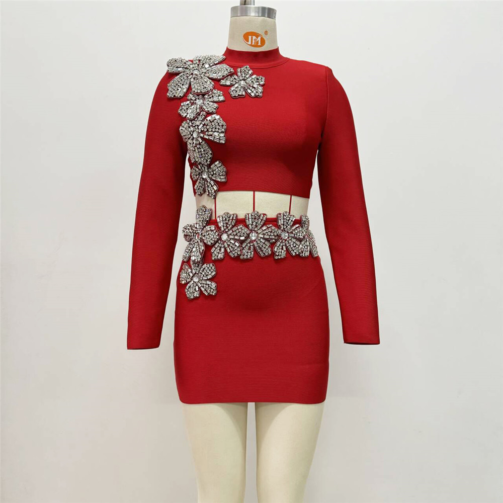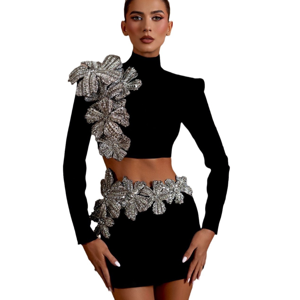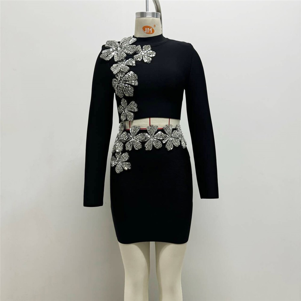 New European and American two-piece long sleeved top with hip bandage mini skirt, heavy-duty flower decoration, European and American foreign trade women's clothing