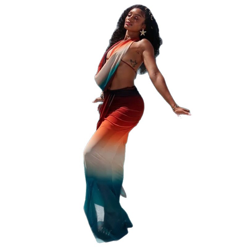European and American style foreign trade mesh vacation and refreshing skirt set with hip hugging, swinging collar, exposed back, gradually changing color two-piece set for women's wear