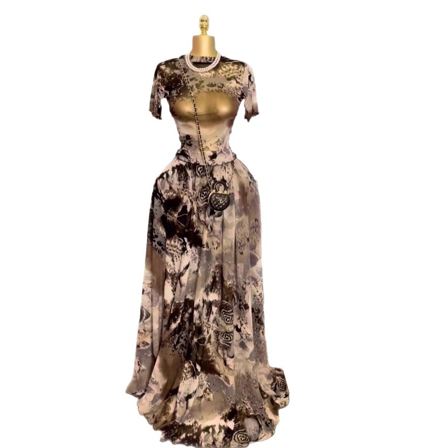 Spot 2025 Cross border European and American Women's Printed Mesh Perspective Top Half length Long Skirt Short Sleeve Autumn 2-piece Set Skirt