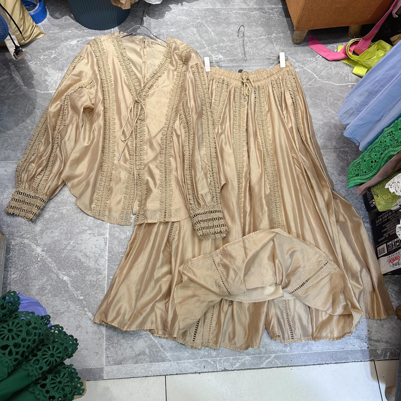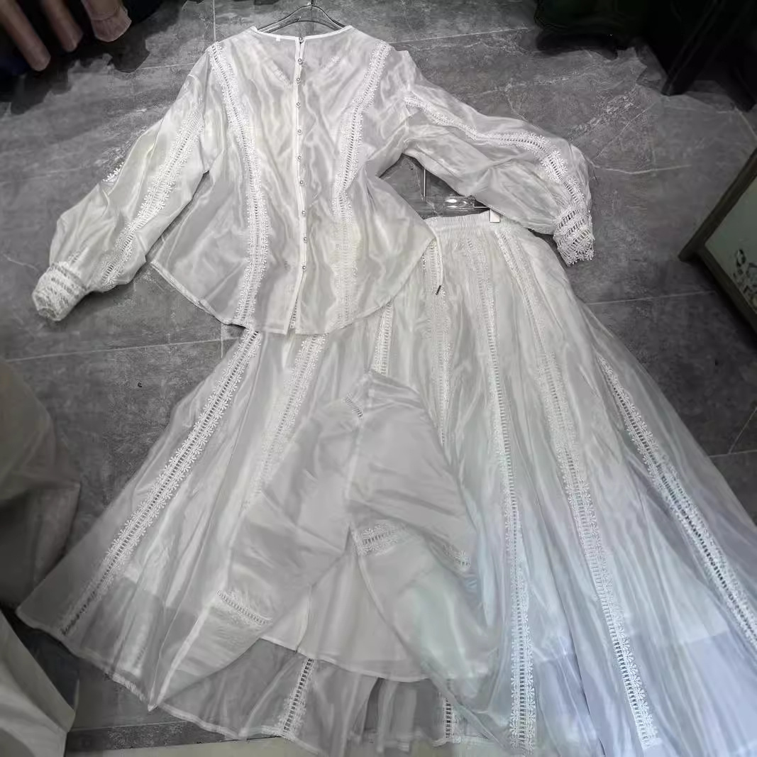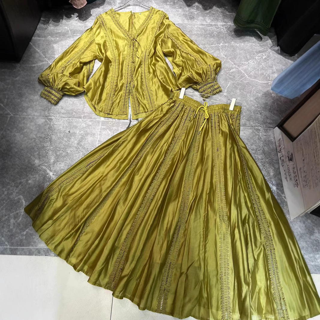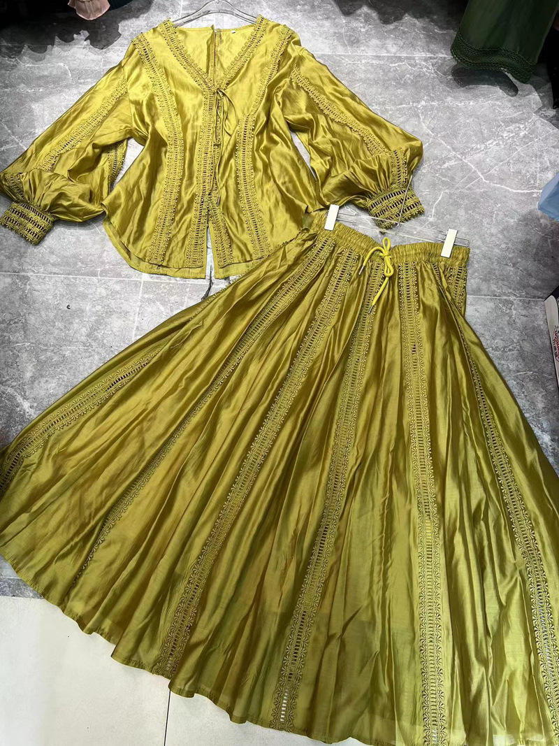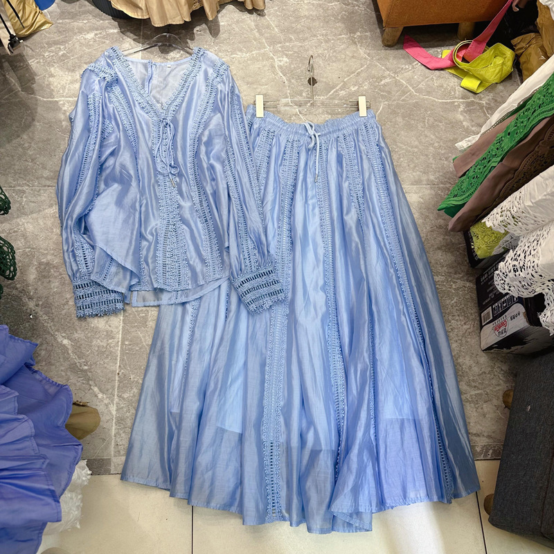 Thirteen new export heavy industry lace long sleeved shirt+large swing long skirt 2-piece set A2 # 8795