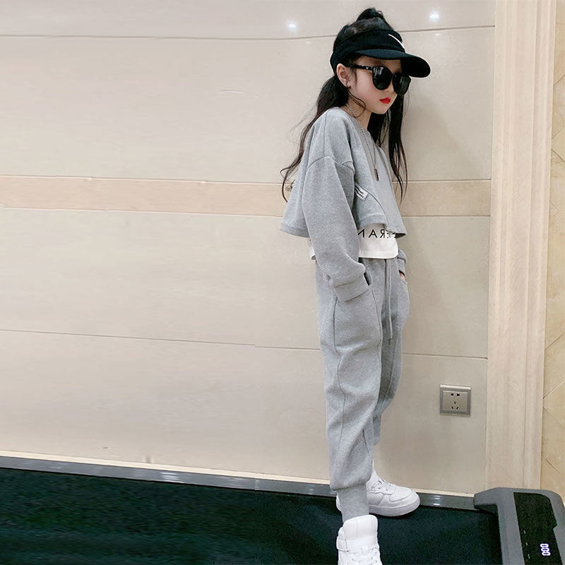 Children's clothing, women's autumn set, western-style girls' autumn clothes, long sleeved fake two-piece hoodie, children's two-piece set, sportswear