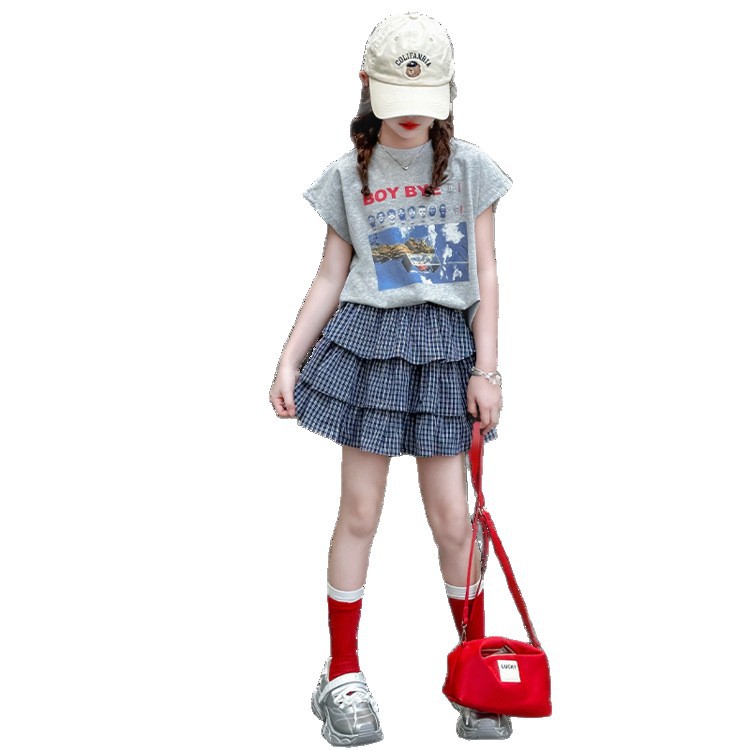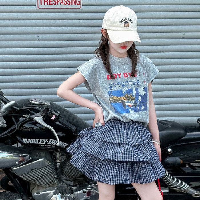 Girls' Korean Fashion Skirt Set, Summer New Style, Western Style Letter Sleeveless Top, Checkered Skirt Two Piece Set