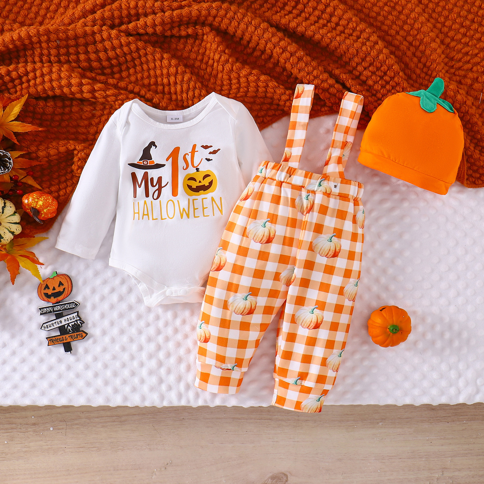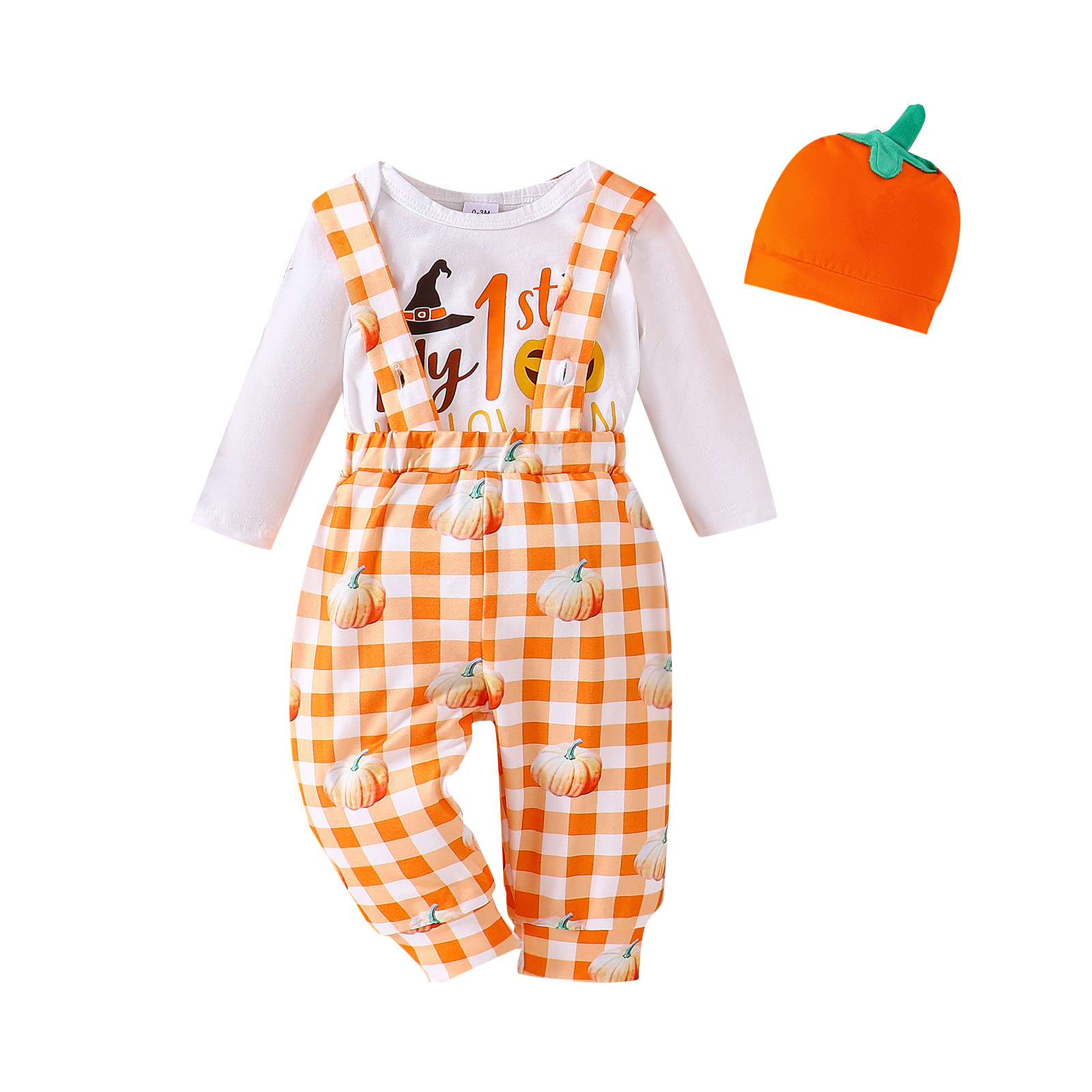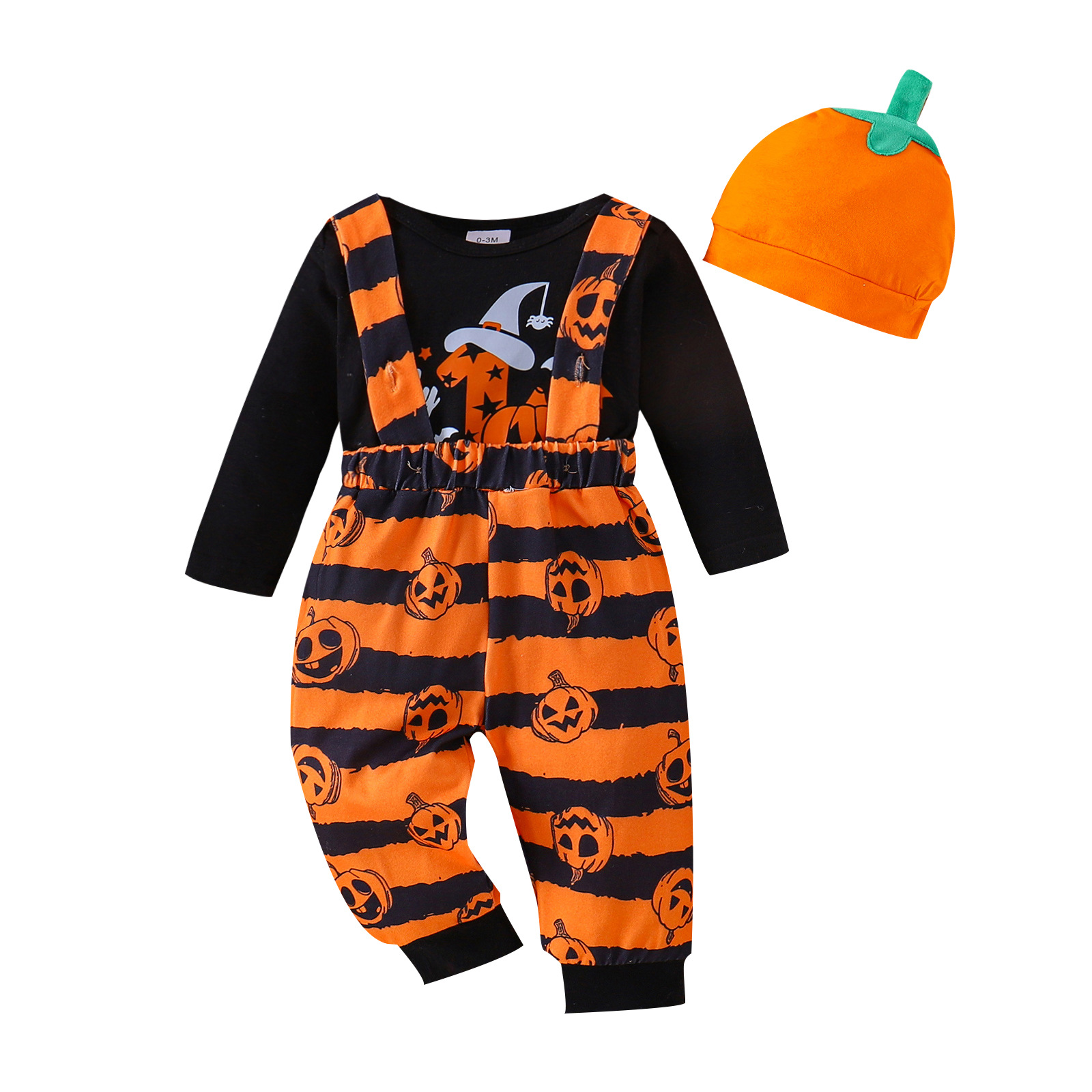 European and American Halloween sets for boys and girls with pumpkin bat patterns, long sleeved clothes, suspenders, long pants, two-piece set
