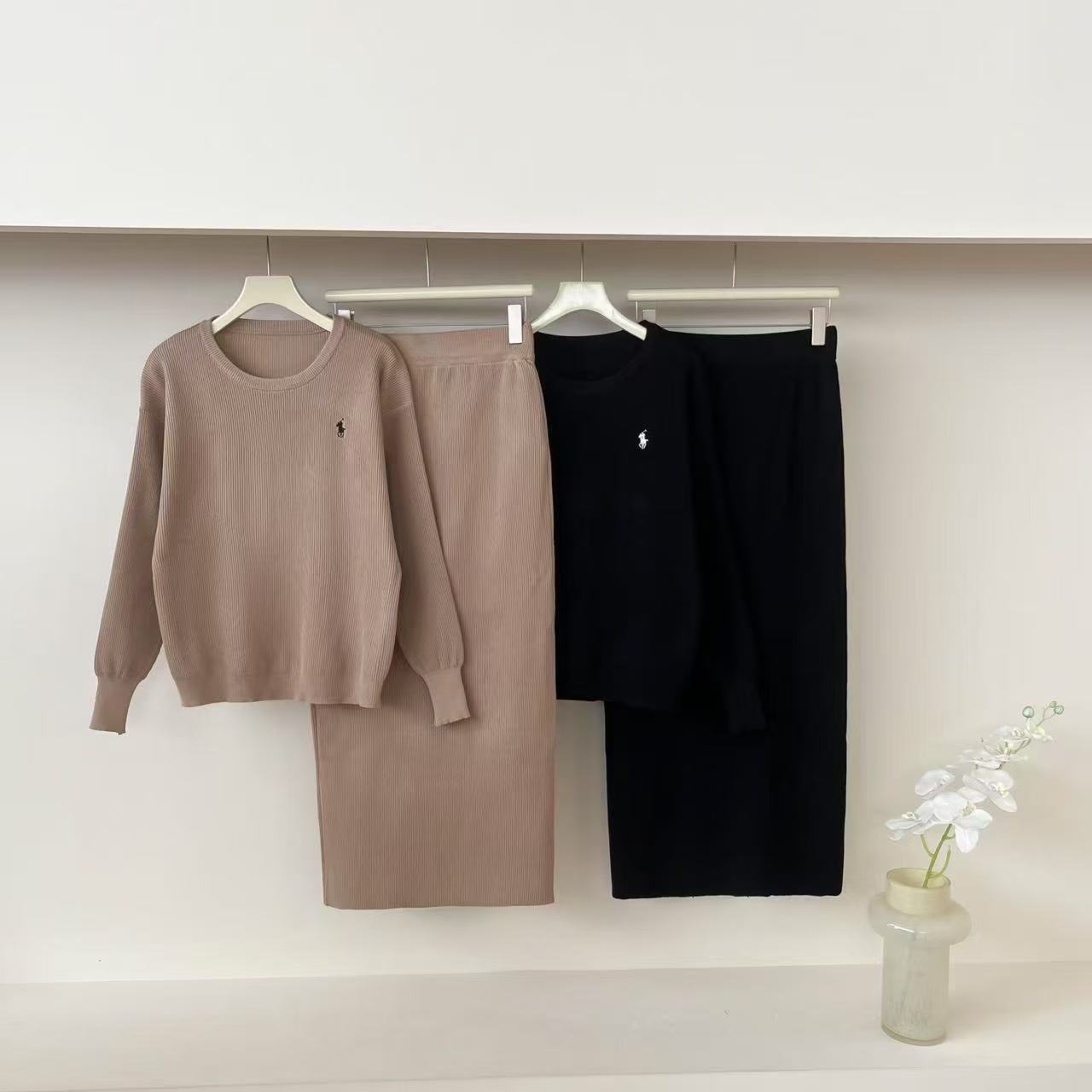 European and American Early Spring Knitted Casual Set with Pony Embroidery Round Neck Loose Top and Skirt Two Piece Set for Women's Foreign Trade