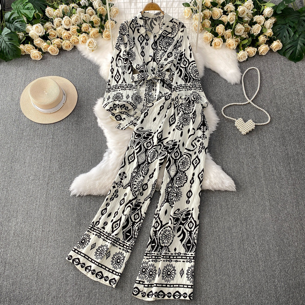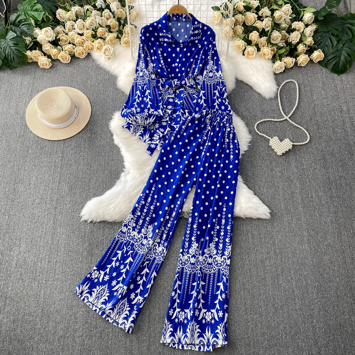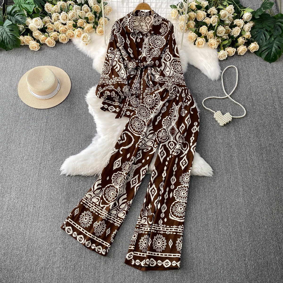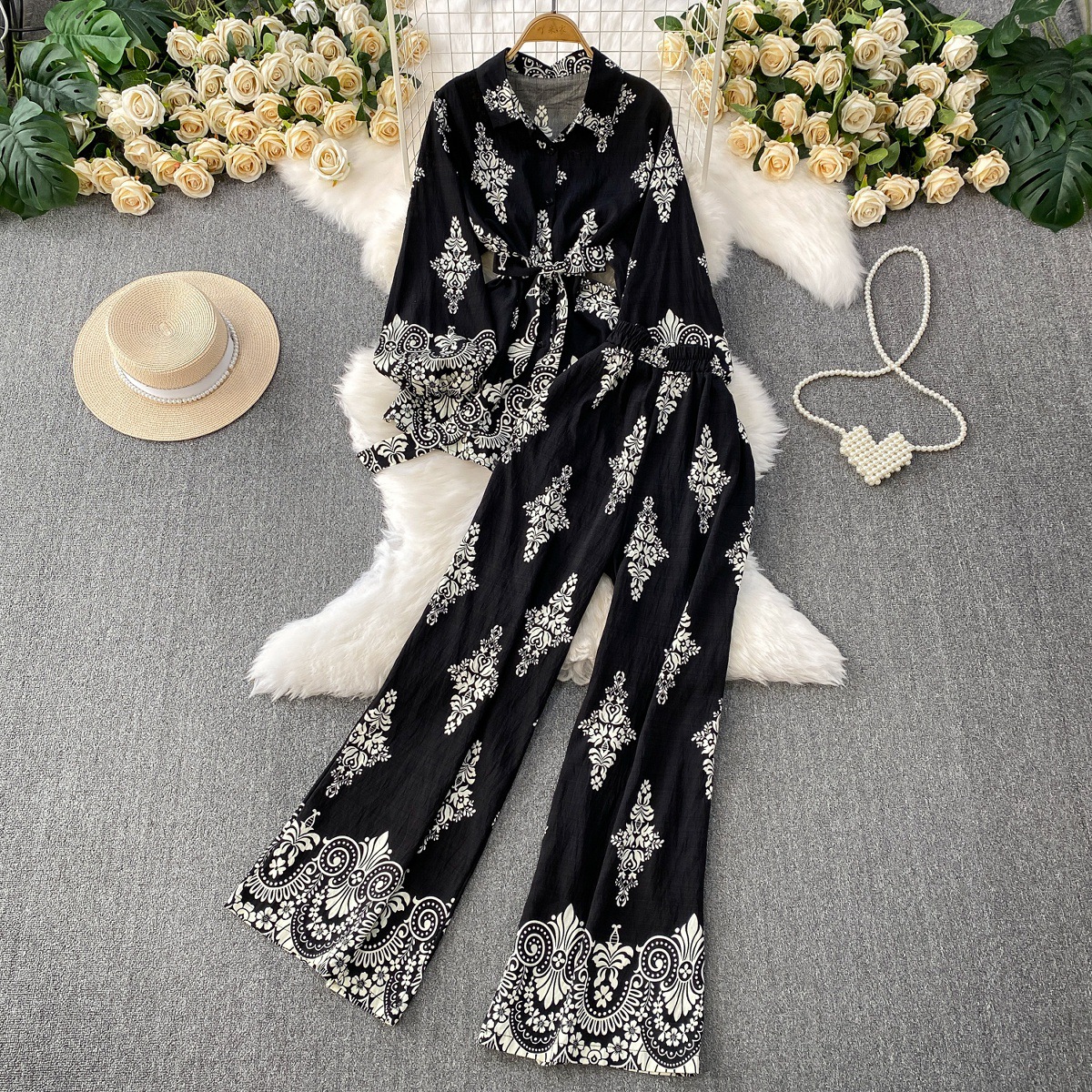 Gentle style pink printed lantern sleeves sun protection shirt with a lapel and waist cinching top+high waist slimming wide leg pants set