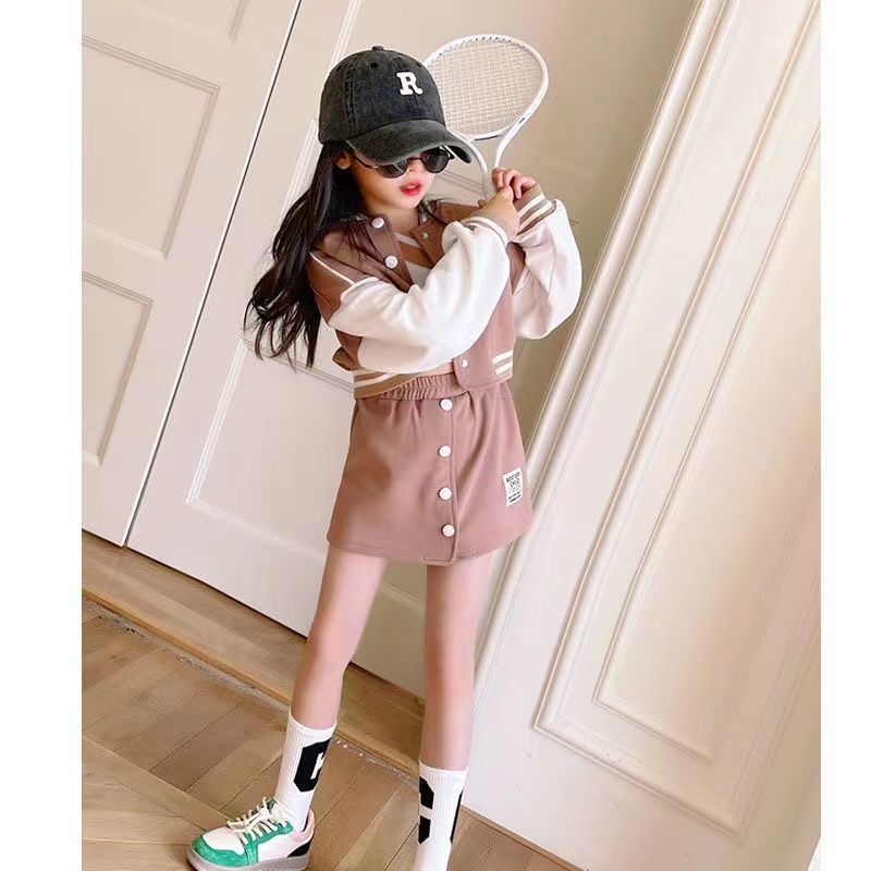 Girls' Spring and Autumn Sports Set 2024 New Baseball Jacket Short Skirt Two Piece Set Korean Version Children's Set
