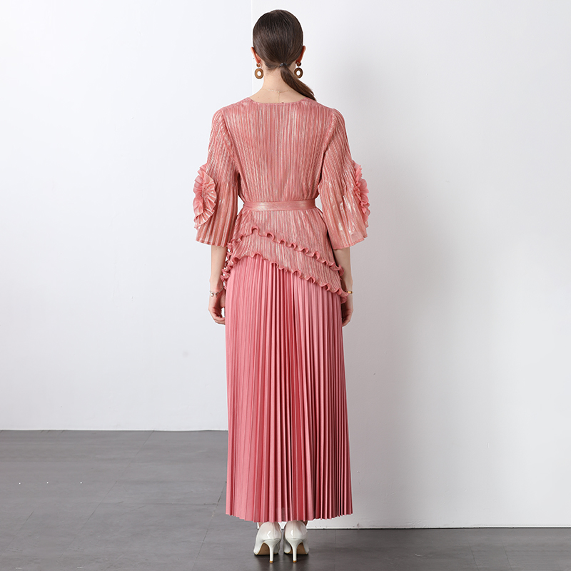 Miyake Foreign Trade Fashion Hot Stamping Curled Edge Plate Flower Design Sense Strap Top High Waist Long Hundred Fold Half Skirt Set
