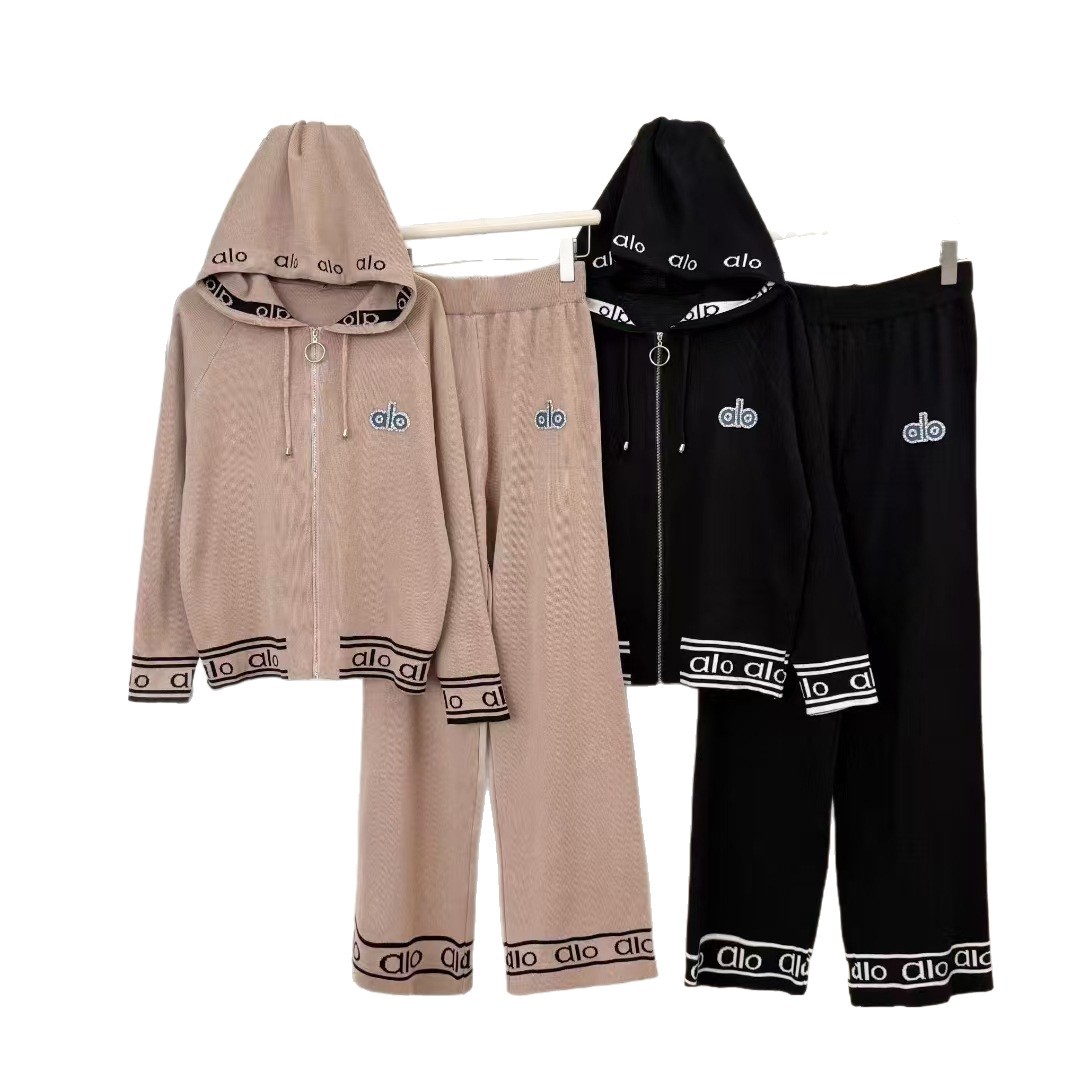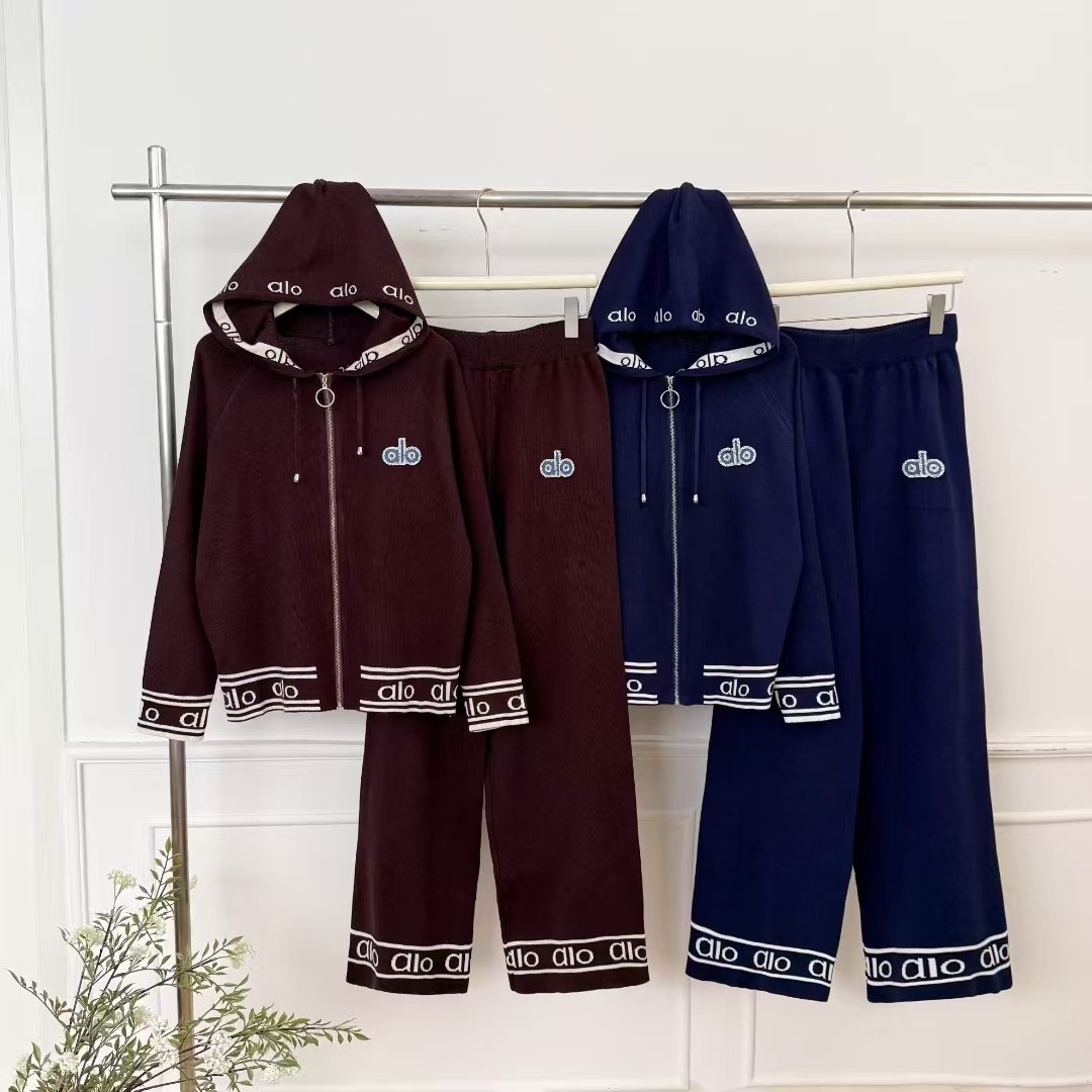 Cross border 2025 Spring and Autumn casual hooded knitted cardigan with contrasting letters, high waist wide leg pants two-piece set