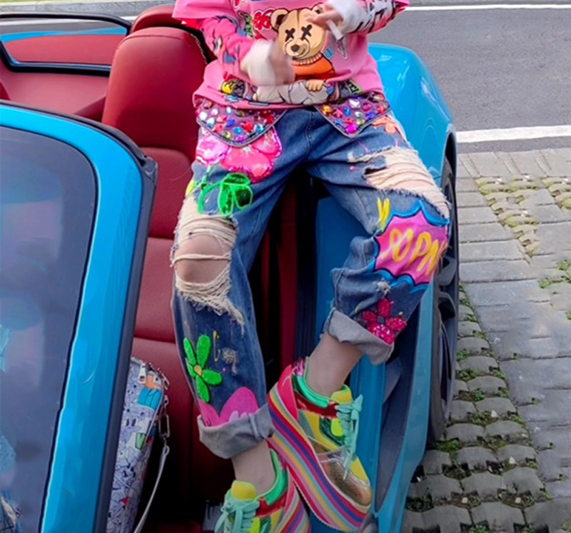 European 2023 Spring New Heavy Industry Nail Bead Piercing Jeans Women's High Waist Loose Straight Pants Cross border Trendy Brand