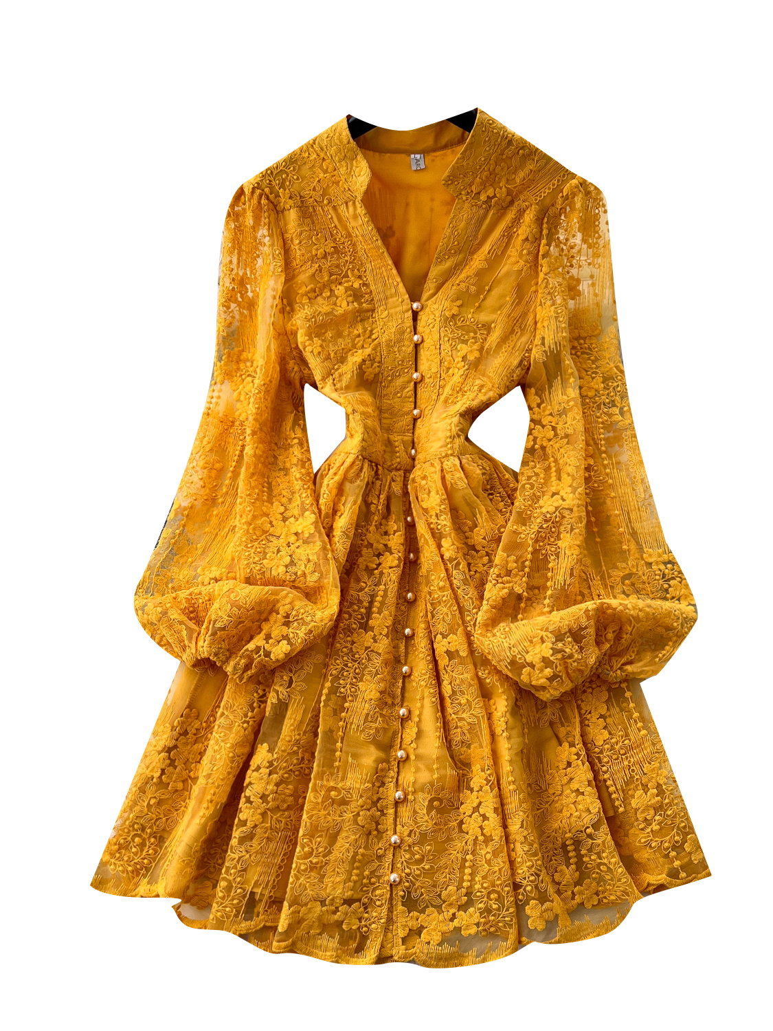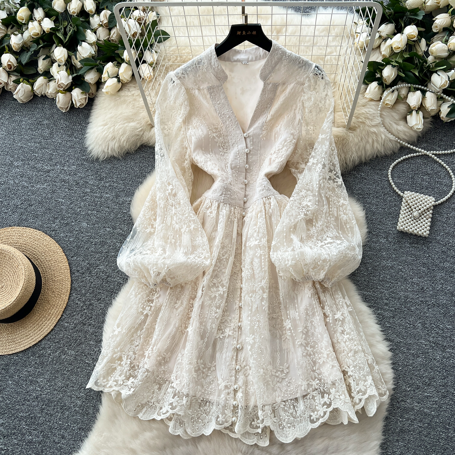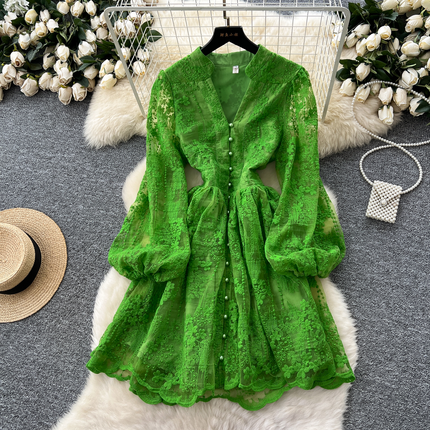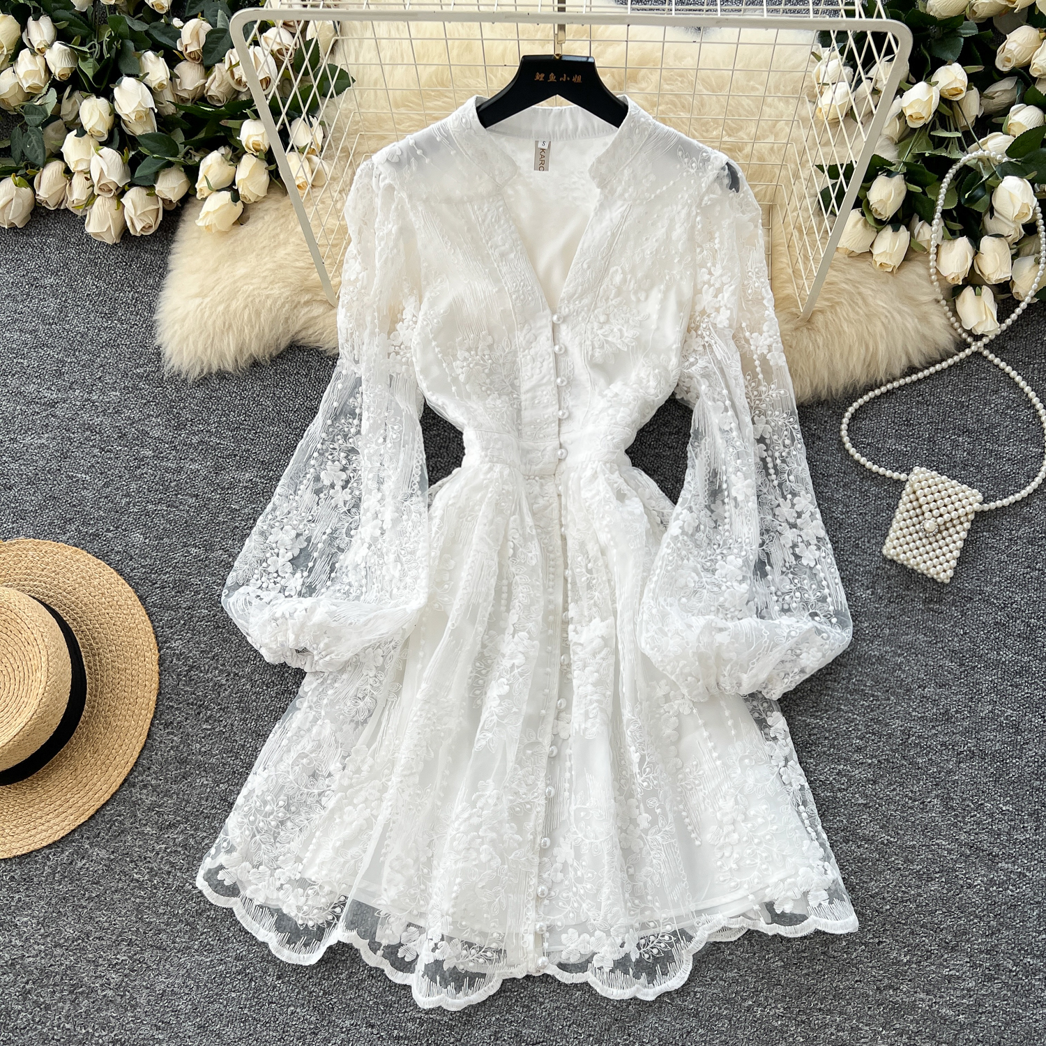 French high-end temperament, light luxury V-neck single breasted lantern sleeve embroidered mesh dress, women's cinched waist slimming A-line skirt