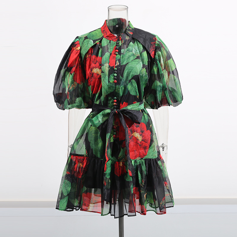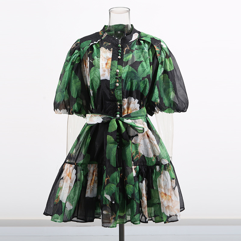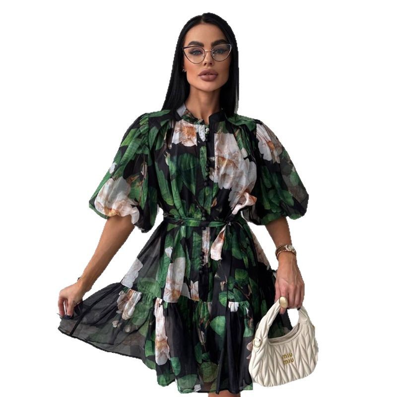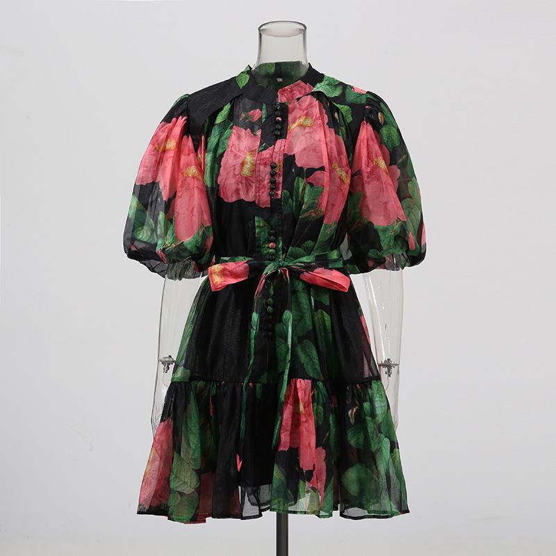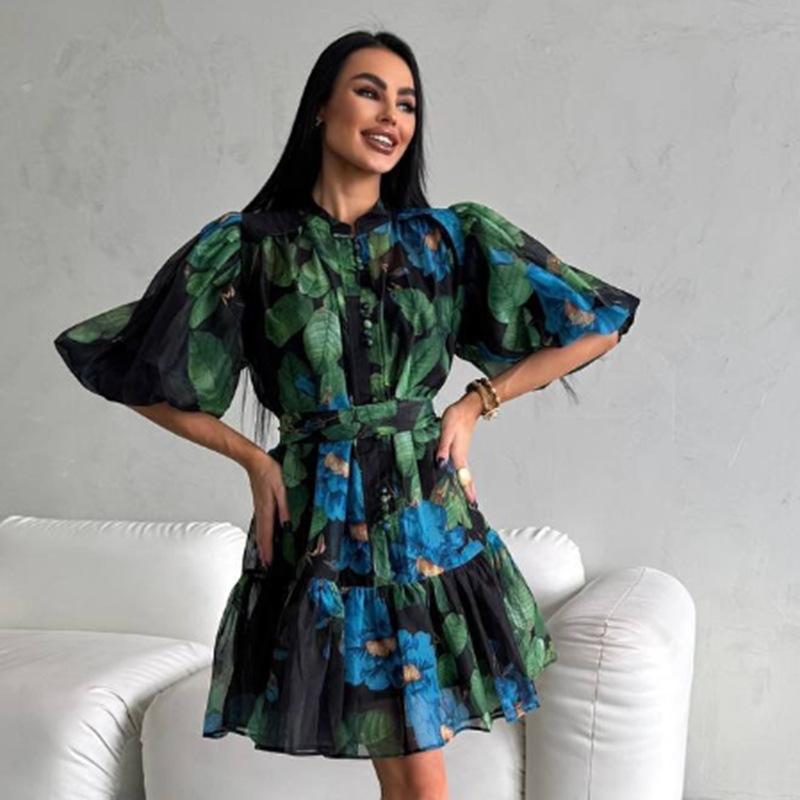 Artistic retro style printed short dress 2025 new style with bubble sleeves, lace up waist cinching, slimming short skirt for women in autumn