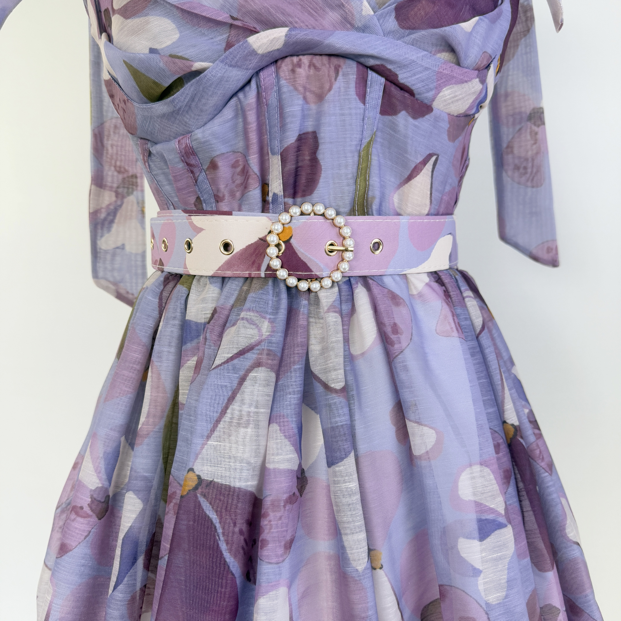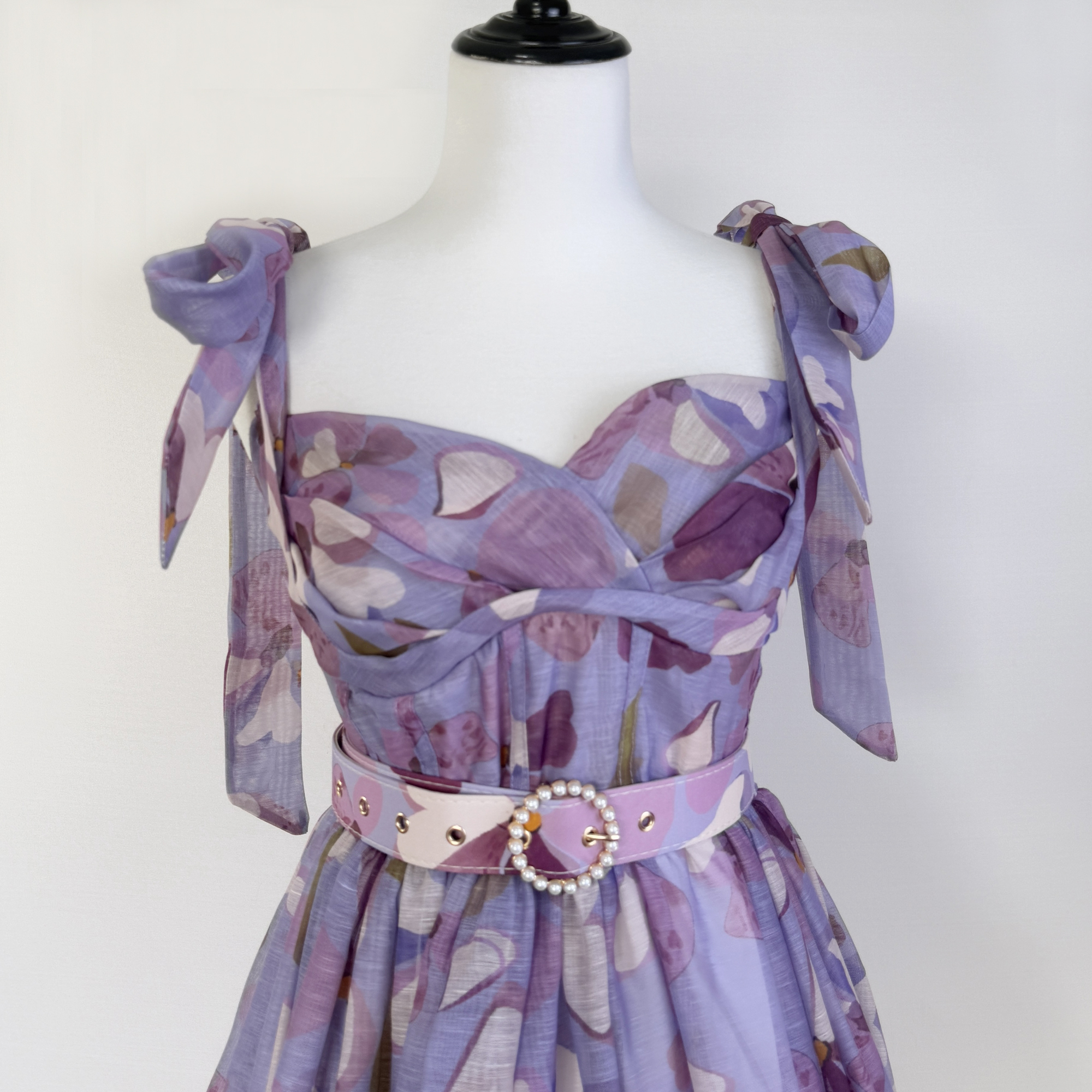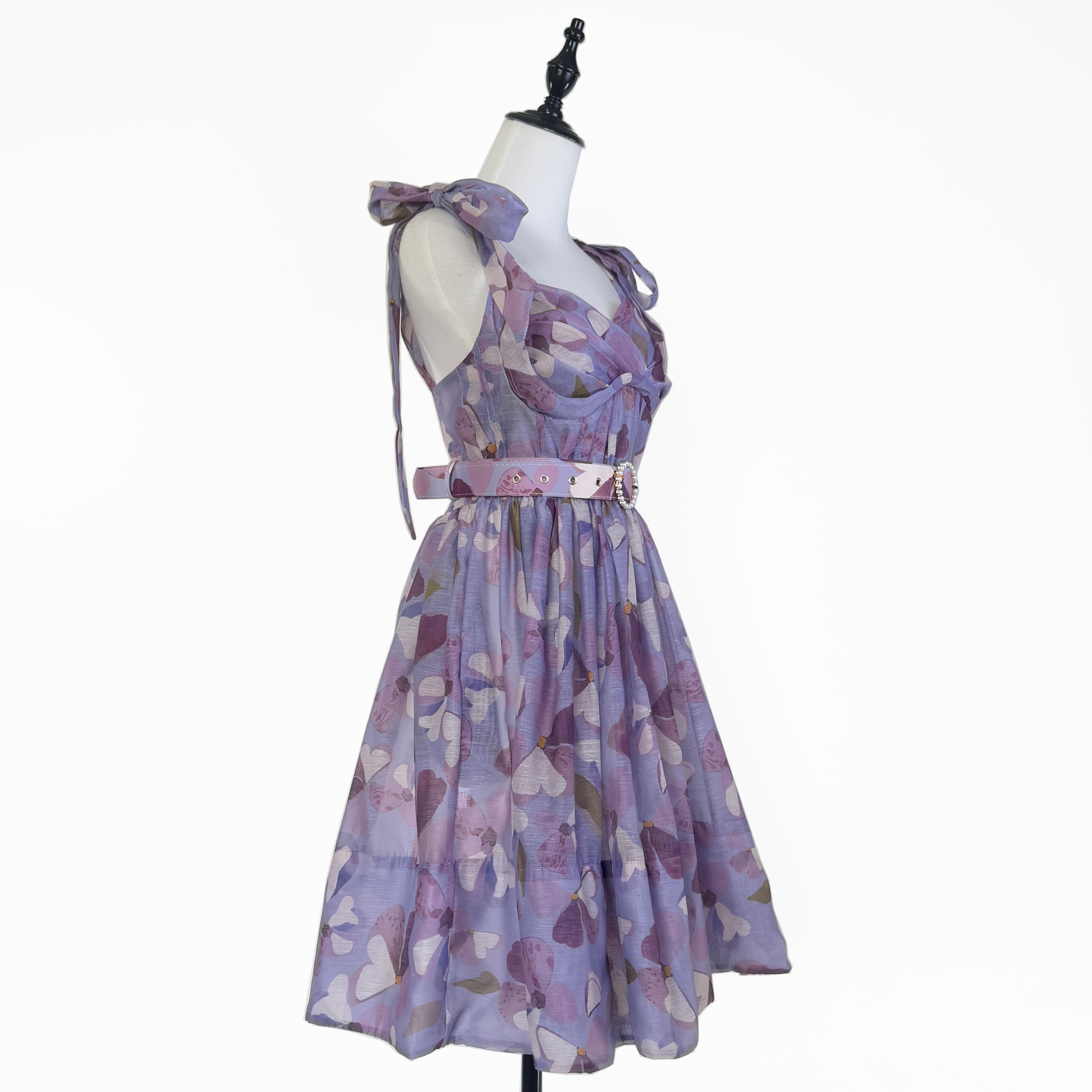 Realistic vintage print with elegant elastic bow at the back, silk and linen fluffy dress, short skirt+belt