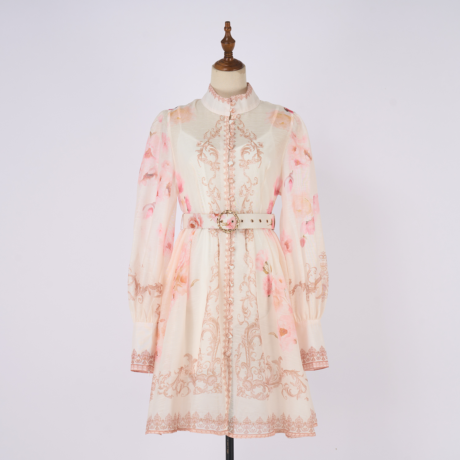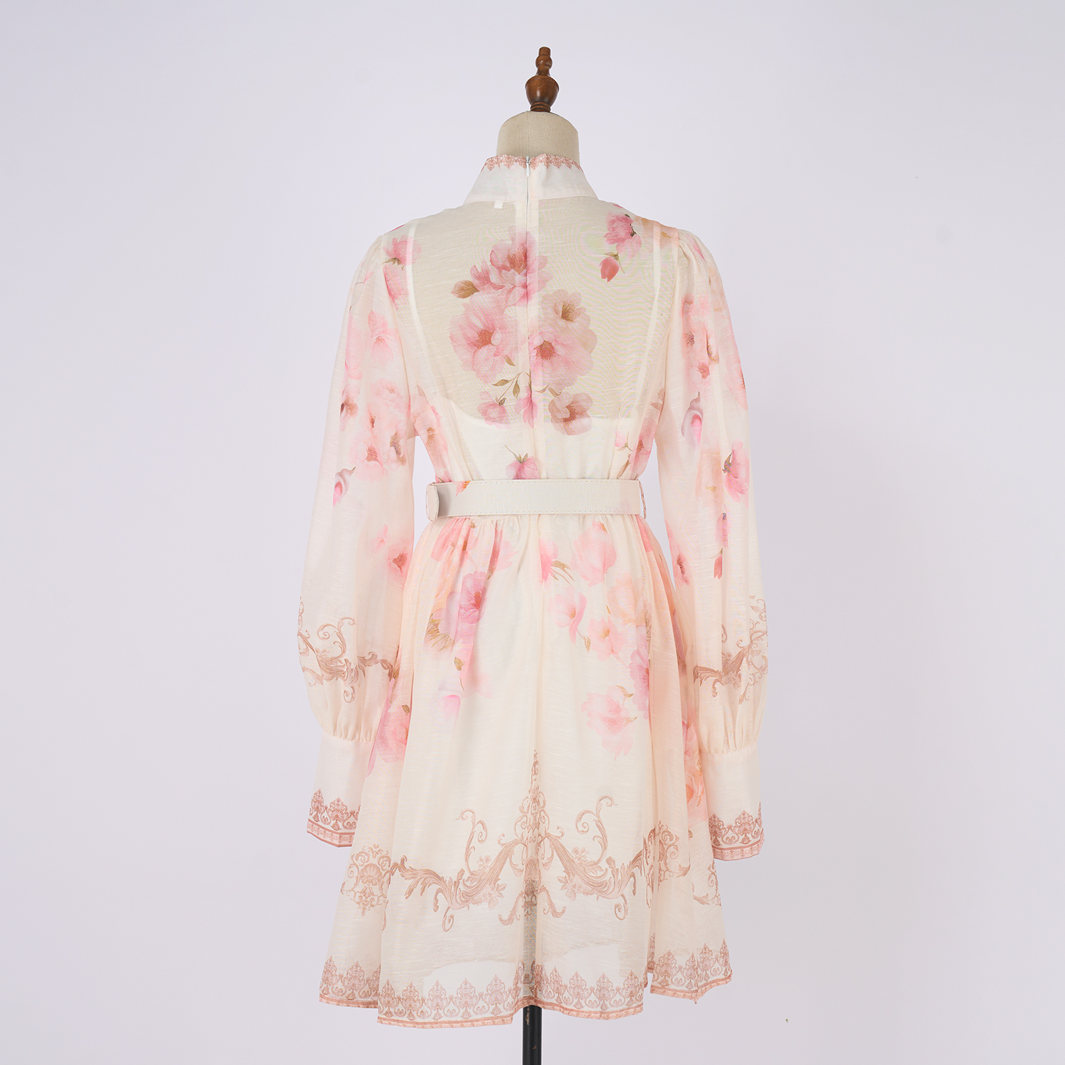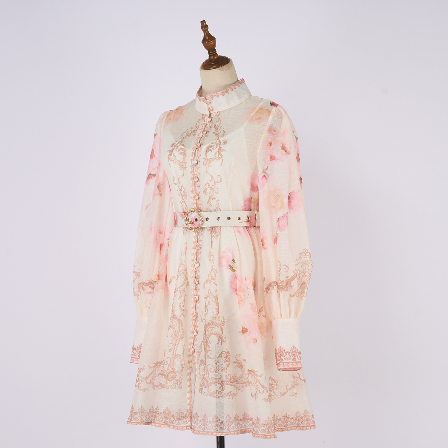 Real shot of Australian niche court style stand up collar, single breasted lantern sleeves, positioning printed waist cinching dress, short skirt