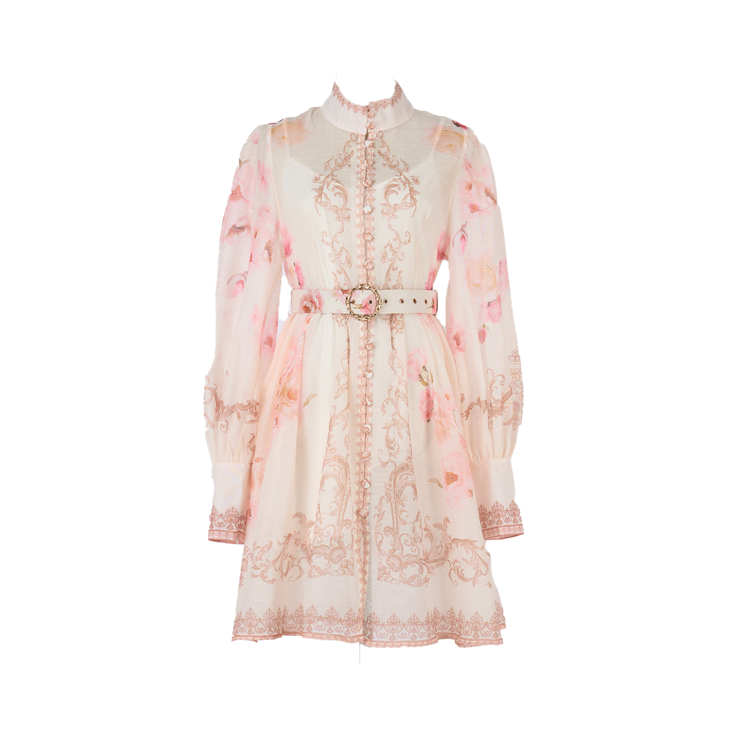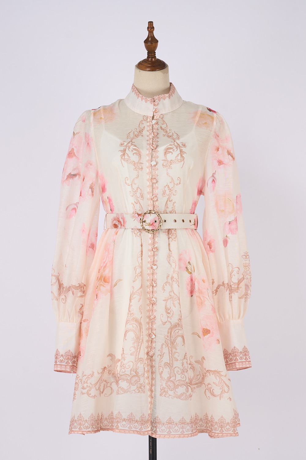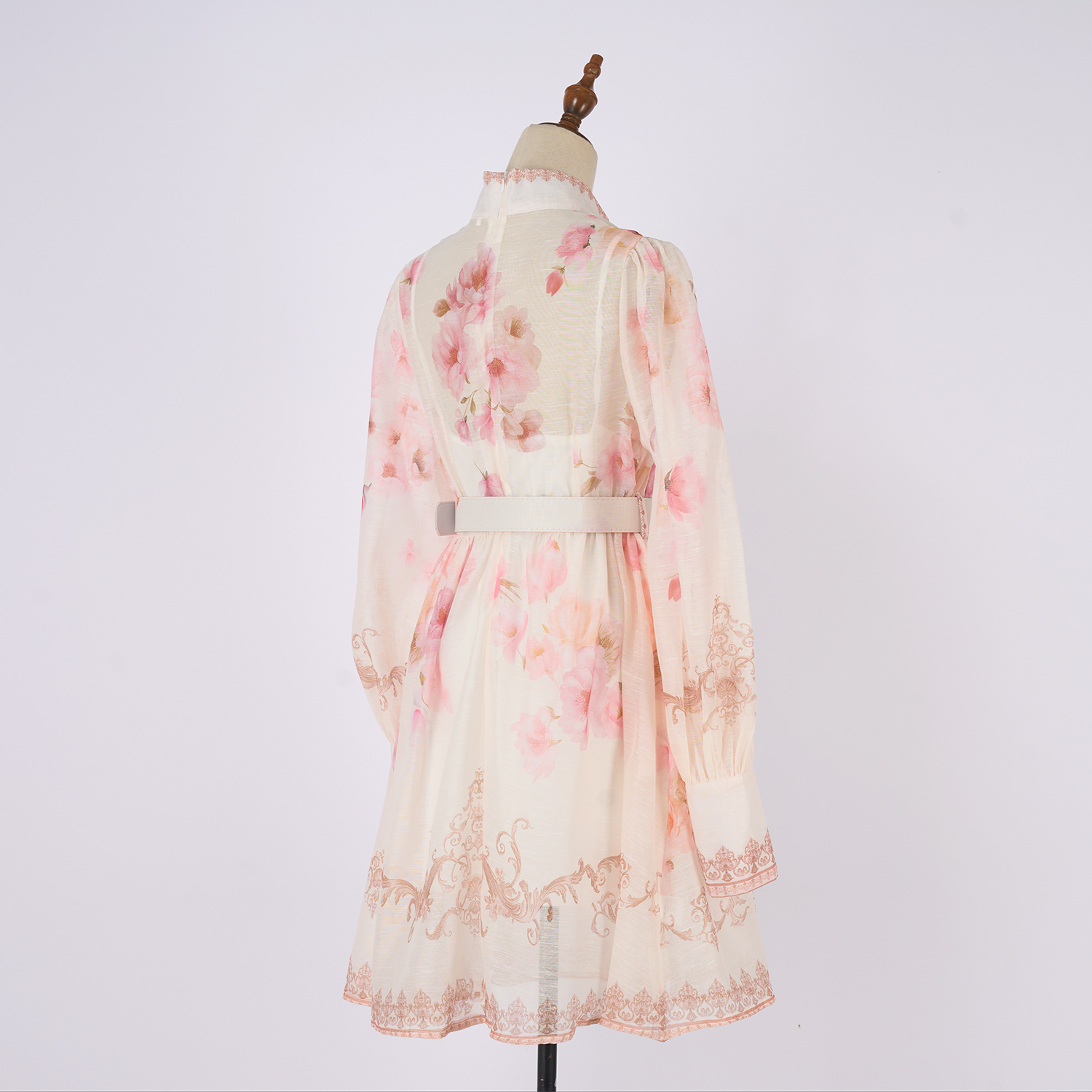 Real shot of Australian niche court style stand up collar, single breasted lantern sleeves, positioning printed waist cinching dress, short skirt