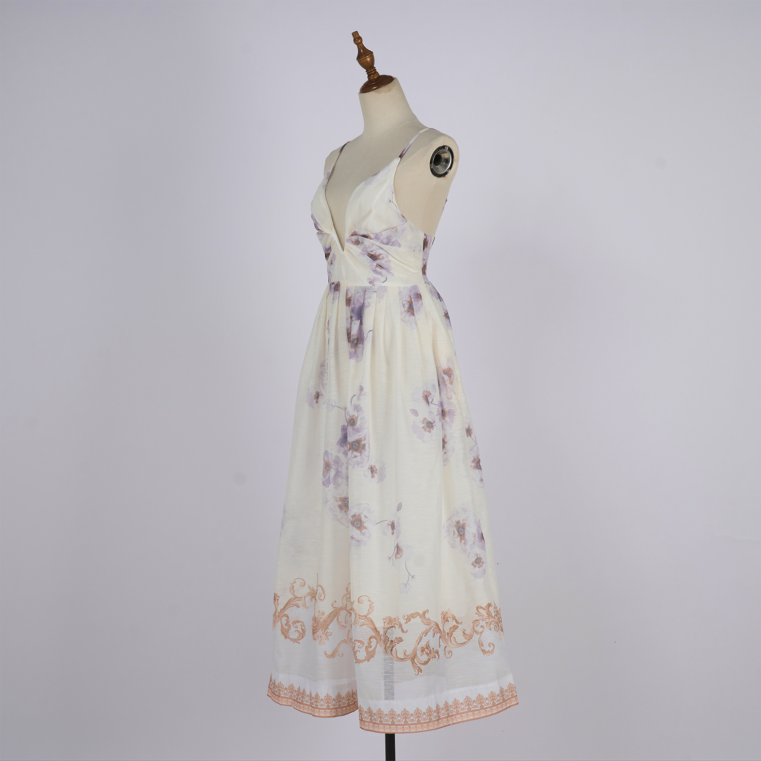 Real time shooting of linen, silk, blue floral pattern, V-neck, medium to long suspender dress