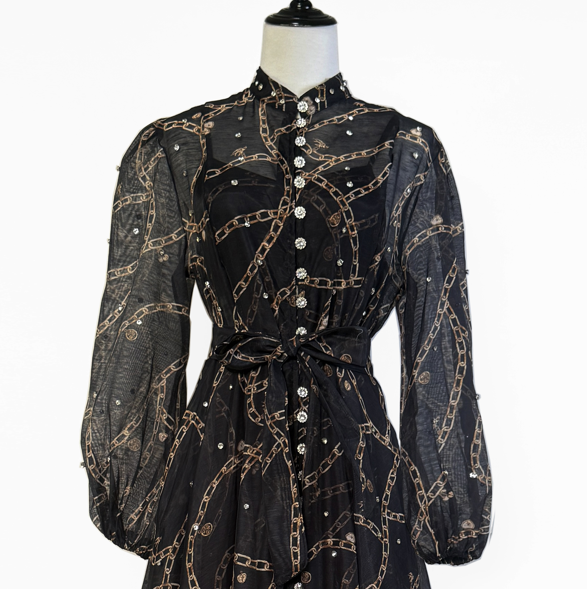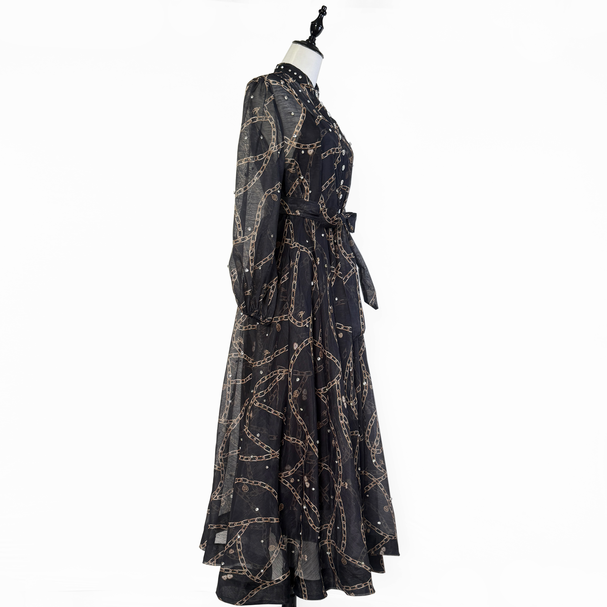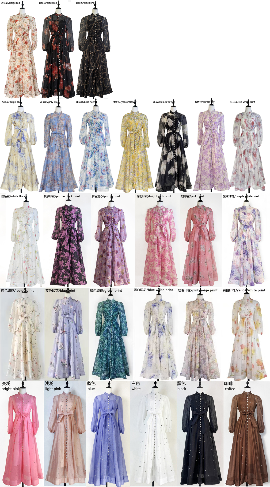 28 color European and American French autumn and winter new lantern sleeve printed nail drill long swing dress photographed in real life