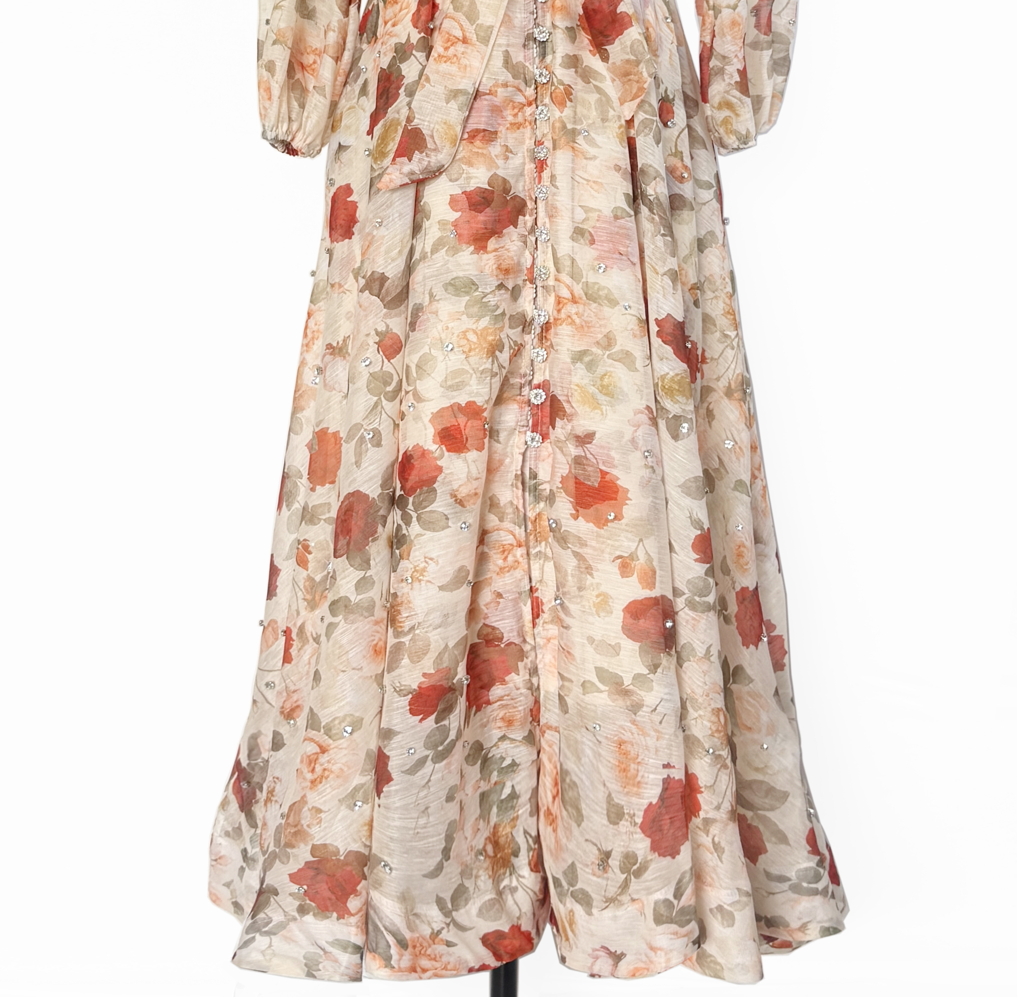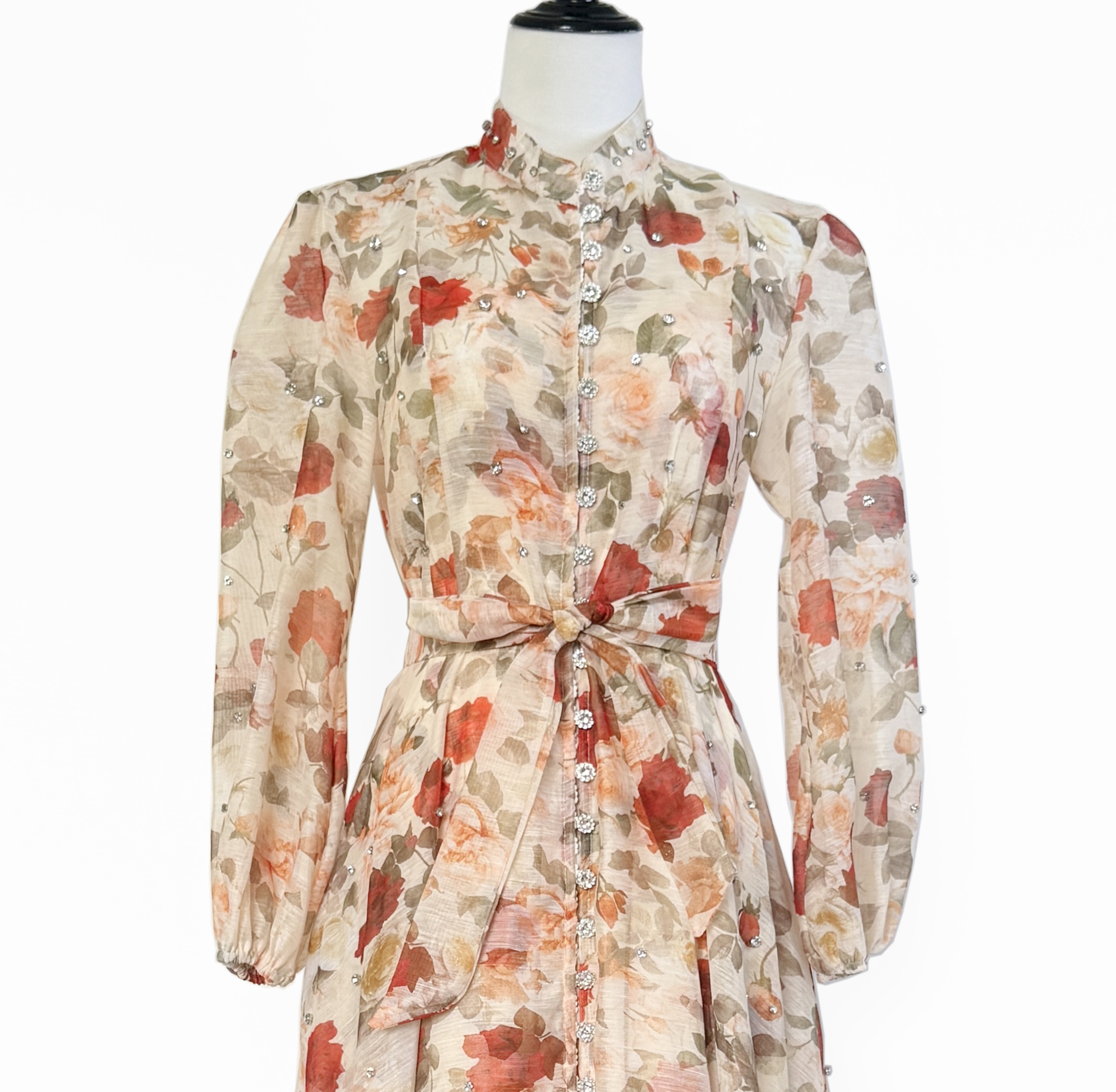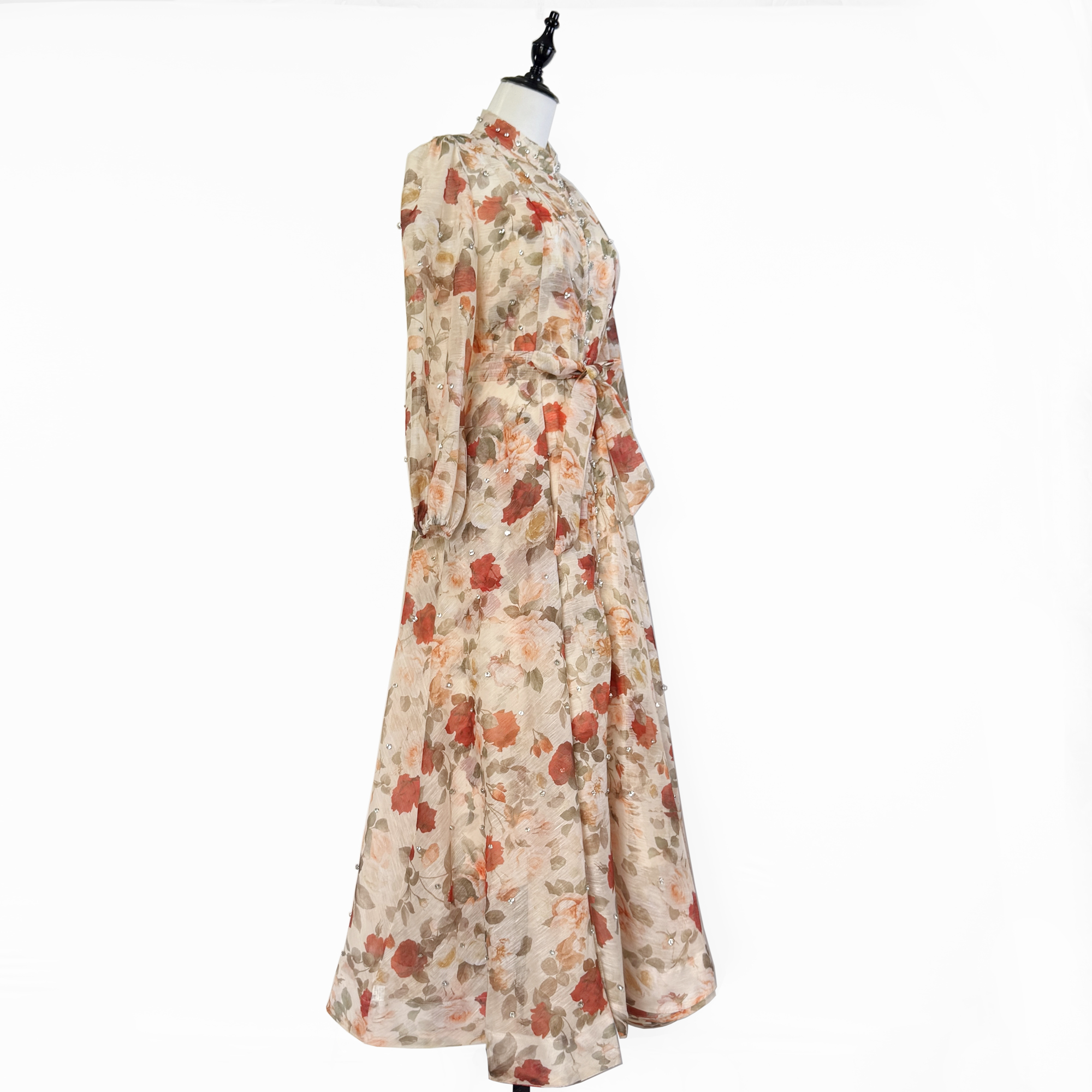 Real shot Australian retro printed light luxury heavy industry nail drill single breasted lantern sleeve long style large swing dress for women