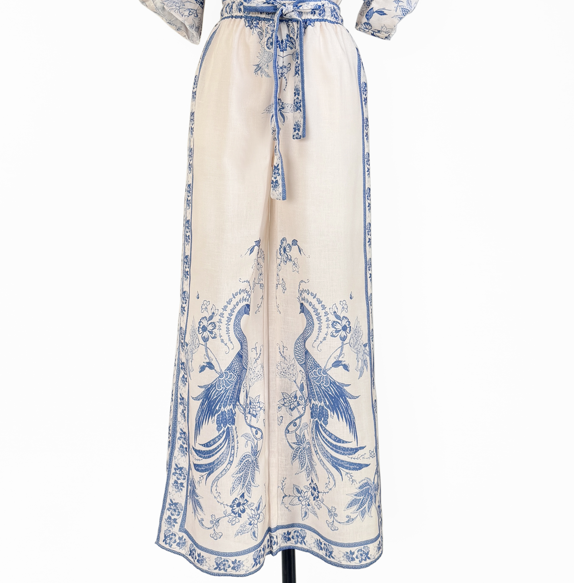Real shooting of autumn new Australian niche printed collar and sleeve shirt+wide leg pants set with two pieces of pants