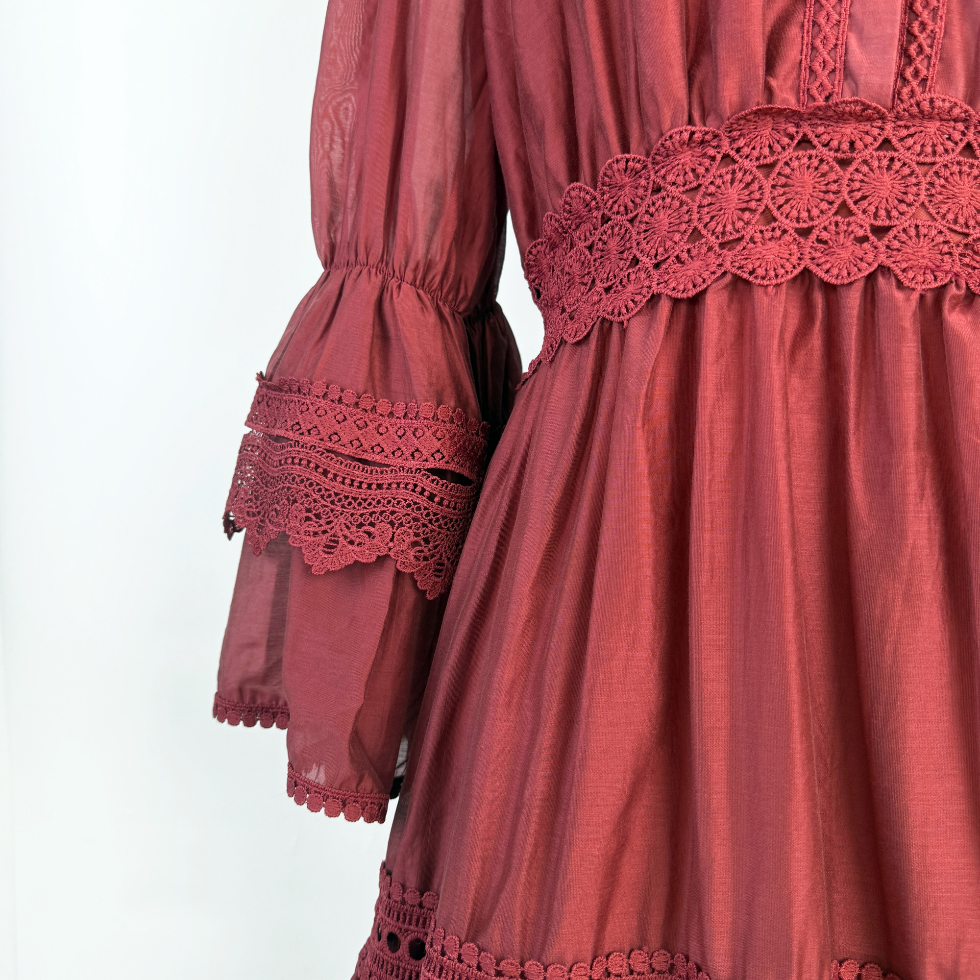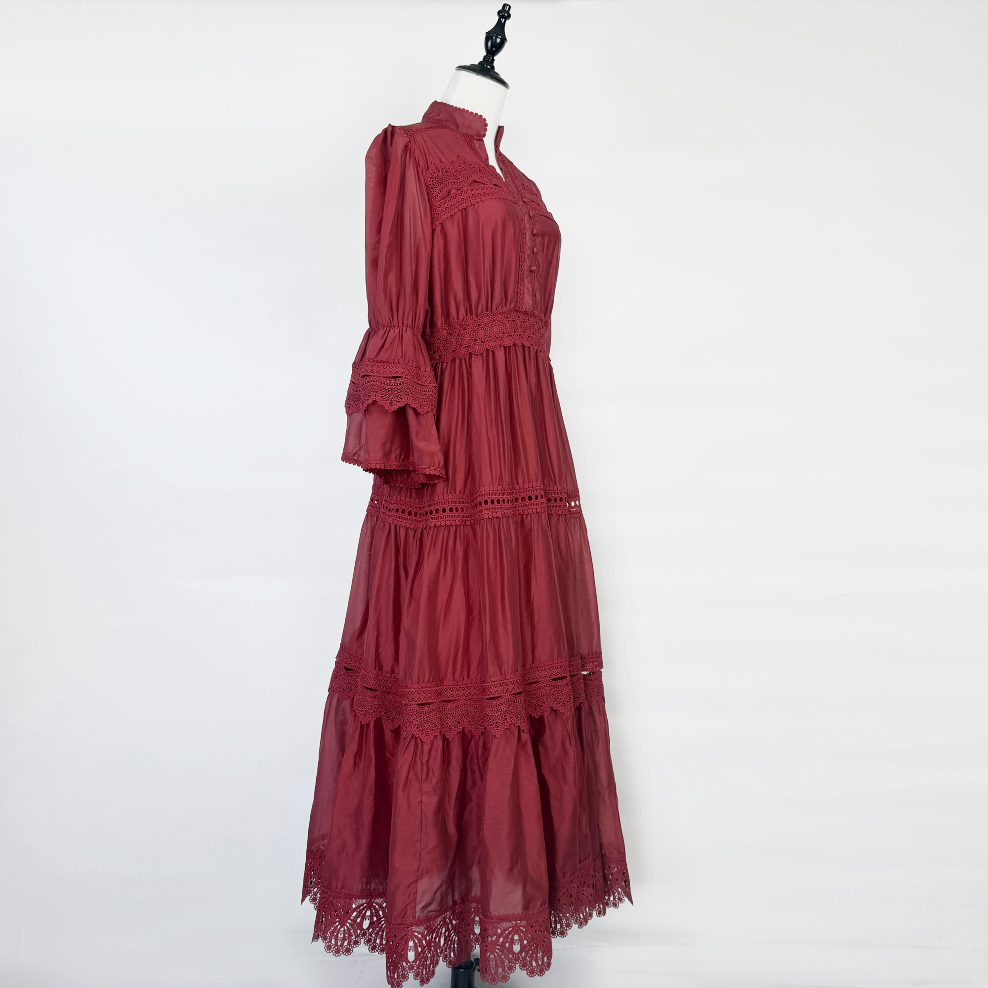 Real shot of the new autumn heavy industry lace hollow splicing V-neck flared sleeve vacation style dress in Europe and America, long