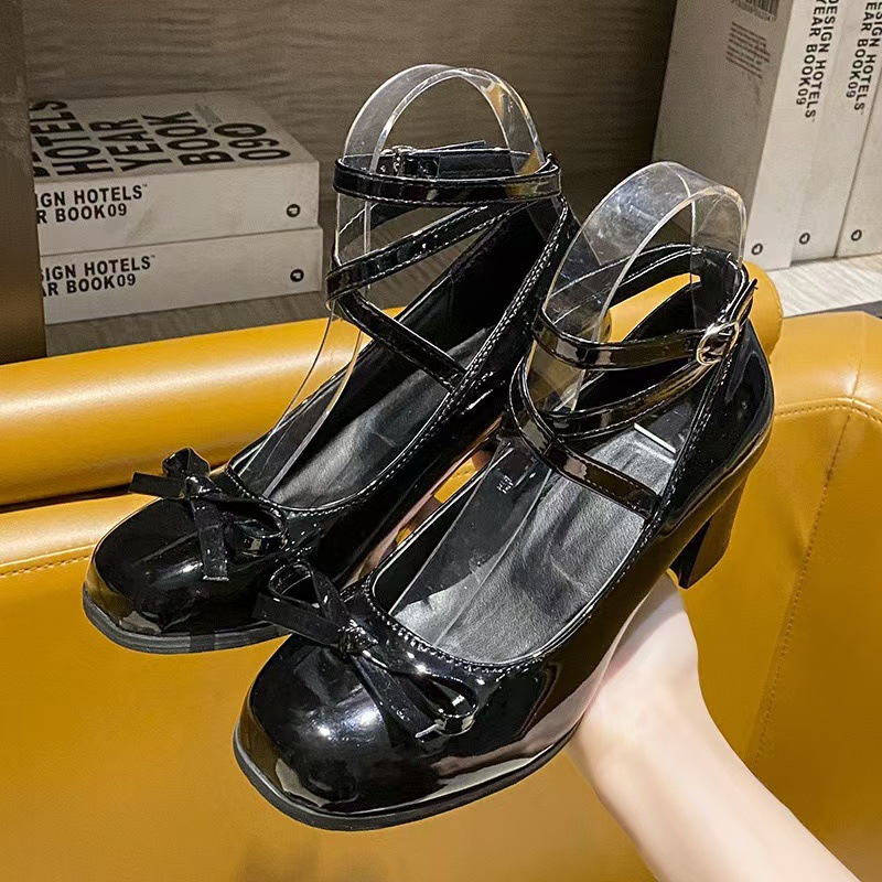 2024 New Spring and Autumn Cross Strap Mary Jane Small Leather Shoes British Style High Heels Bow Forest Female Student Single Shoes