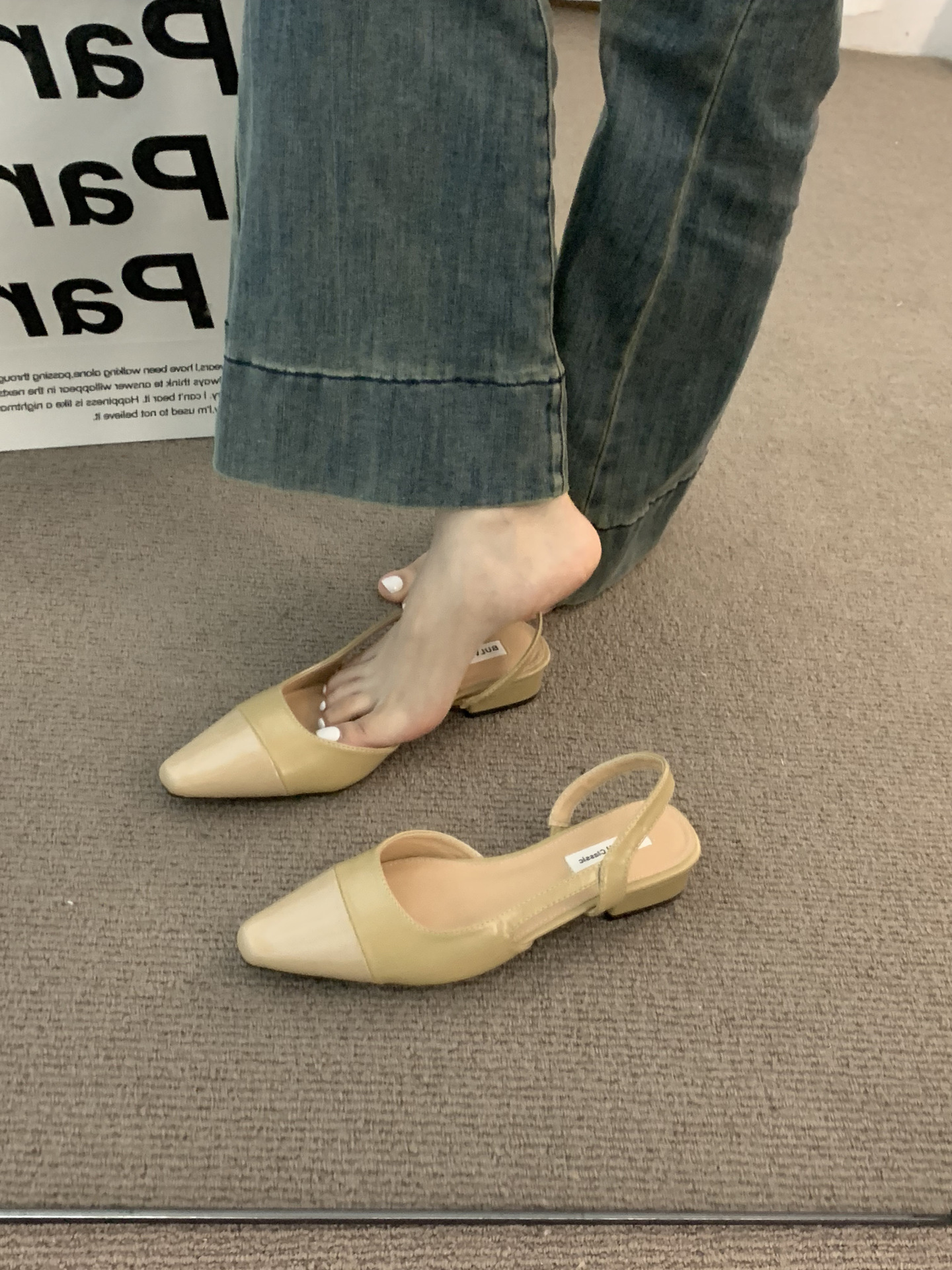 Low heeled toe cap sandals for women, French style, gentle, late night, nude color, pointed tip, small fragrance, ladylike style, thick heel, empty back, temperament, single shoe