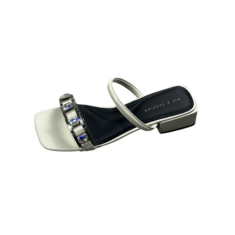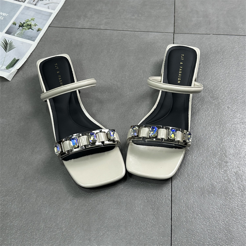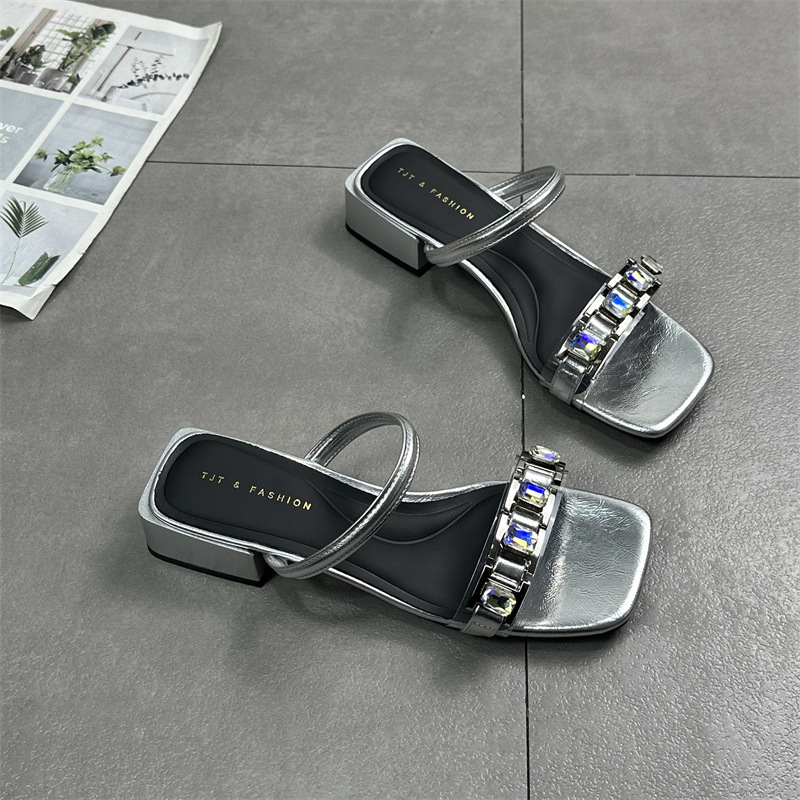 Women's shoes 2024 summer new versatile square toe open toe rhinestone mid heel internet famous cool slippers, half drag, one line drag