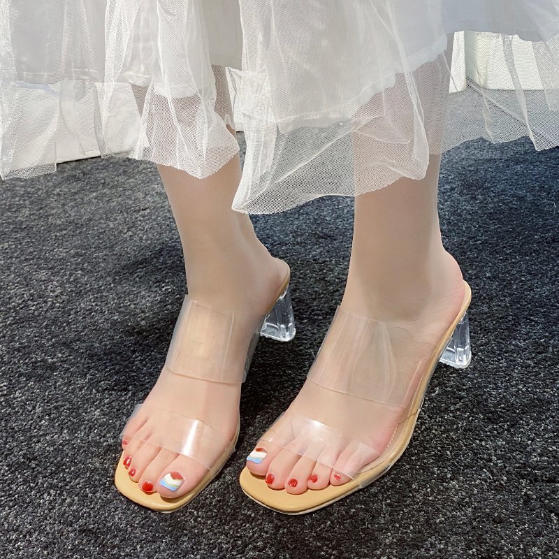 2024 New Summer Transparent Heel High Heel Coarse Heel Simple PVC Cool Slippers with One Word Belt Open Toe Women's Shoes Foreign Trade Shoes