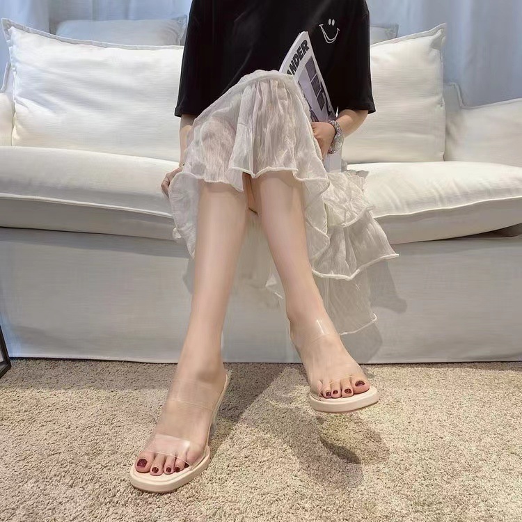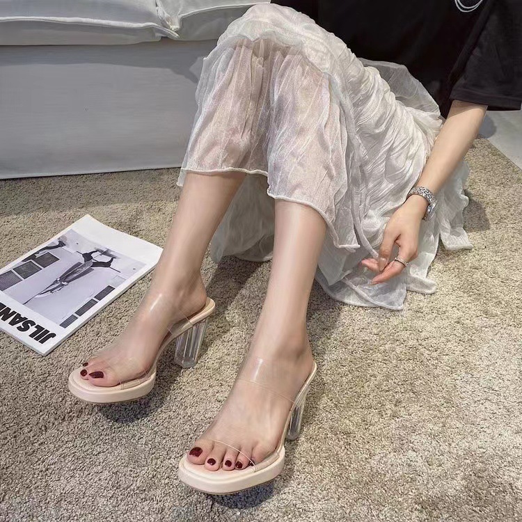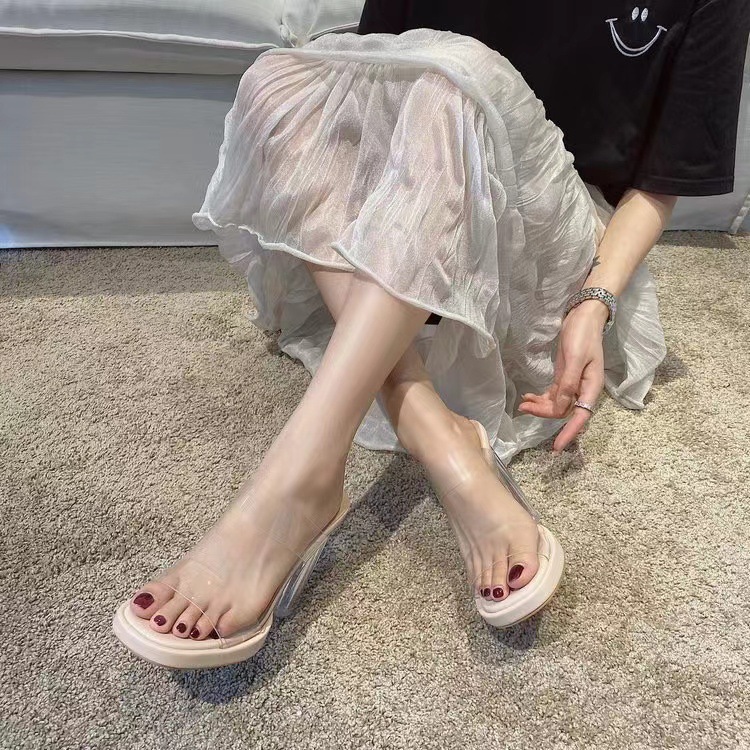 High heeled slippers for women in the summer of 2024, a new style with a straight strap for outdoor wear, fashionable thick and transparent slippers women