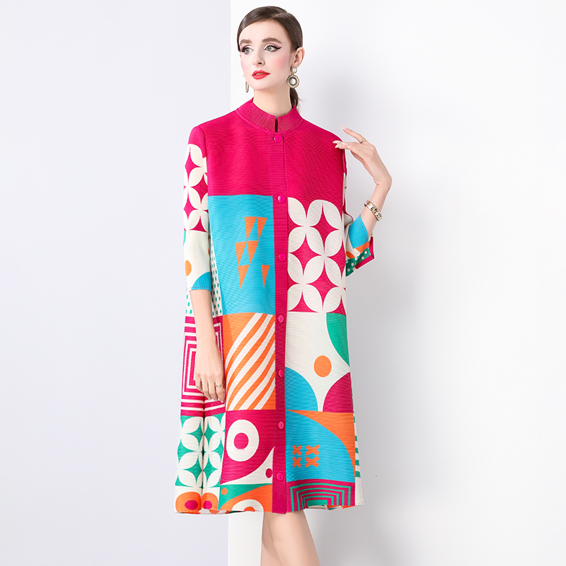 Sanzhai Spring and Autumn Mid length Loose Printed Slimming and Age Reducing Large Size MM Stand up Collar Folded Nine Inch Sleeve Dress