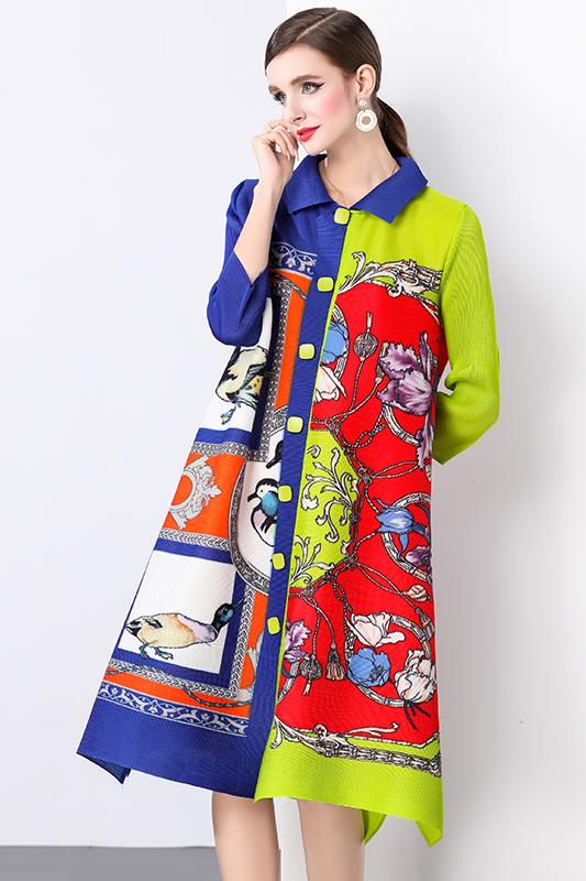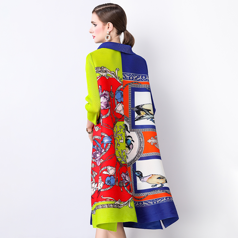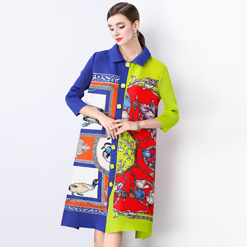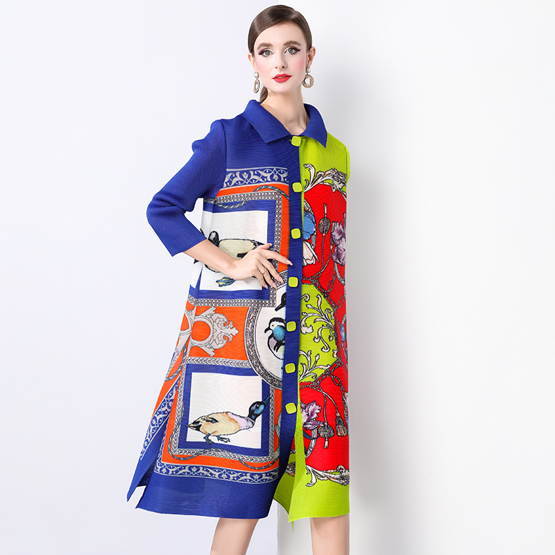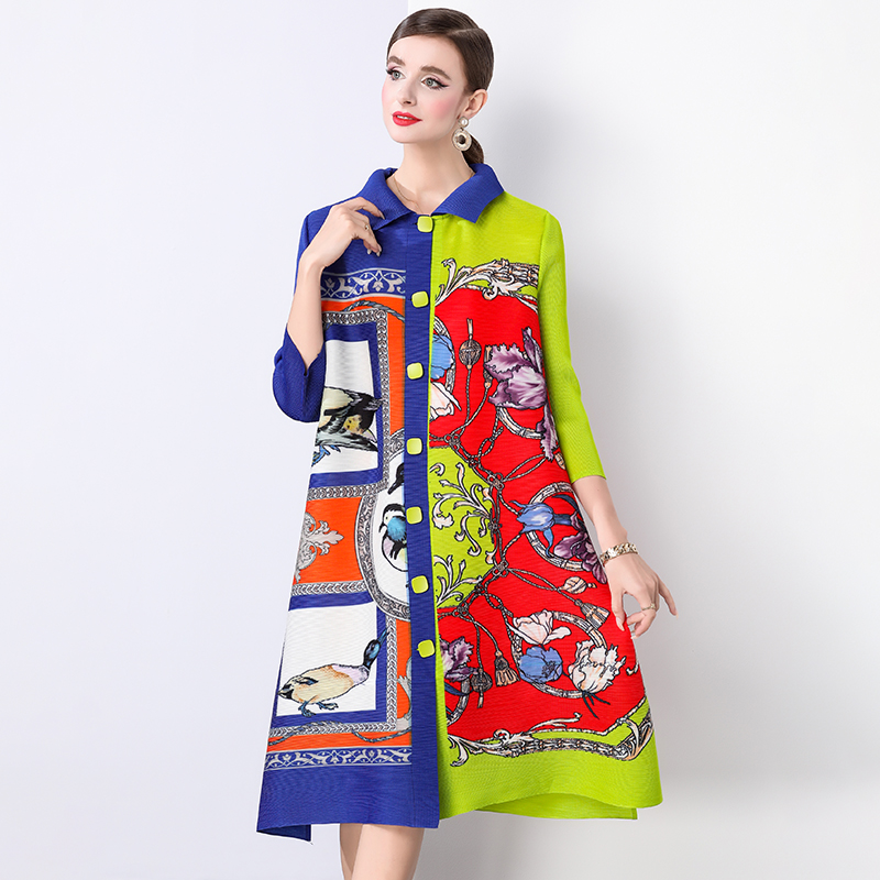 Sanzhai Spring and Autumn Mid length Loose Printed Slimming and Age Reducing Large Size MM Dress with Collar Fold and Nine Cent Sleeve